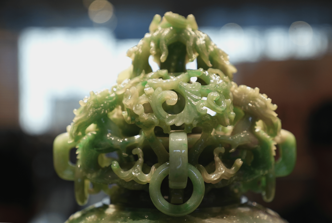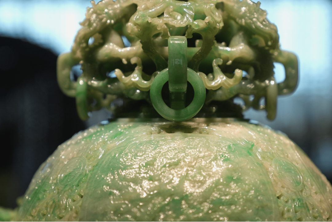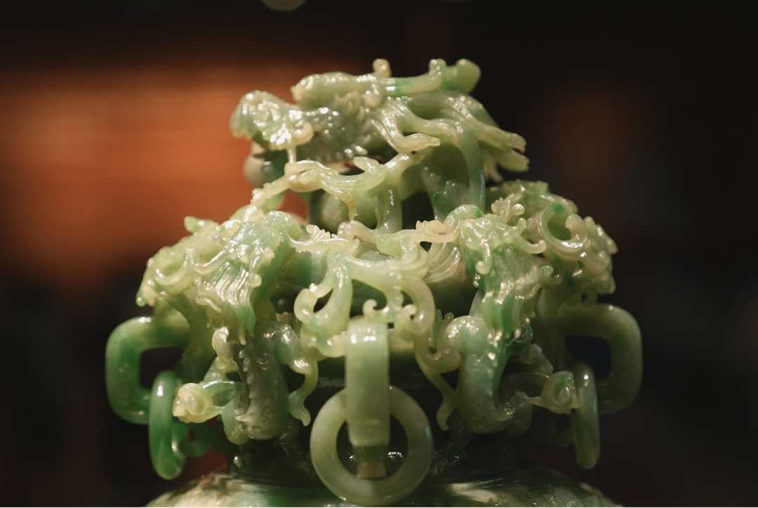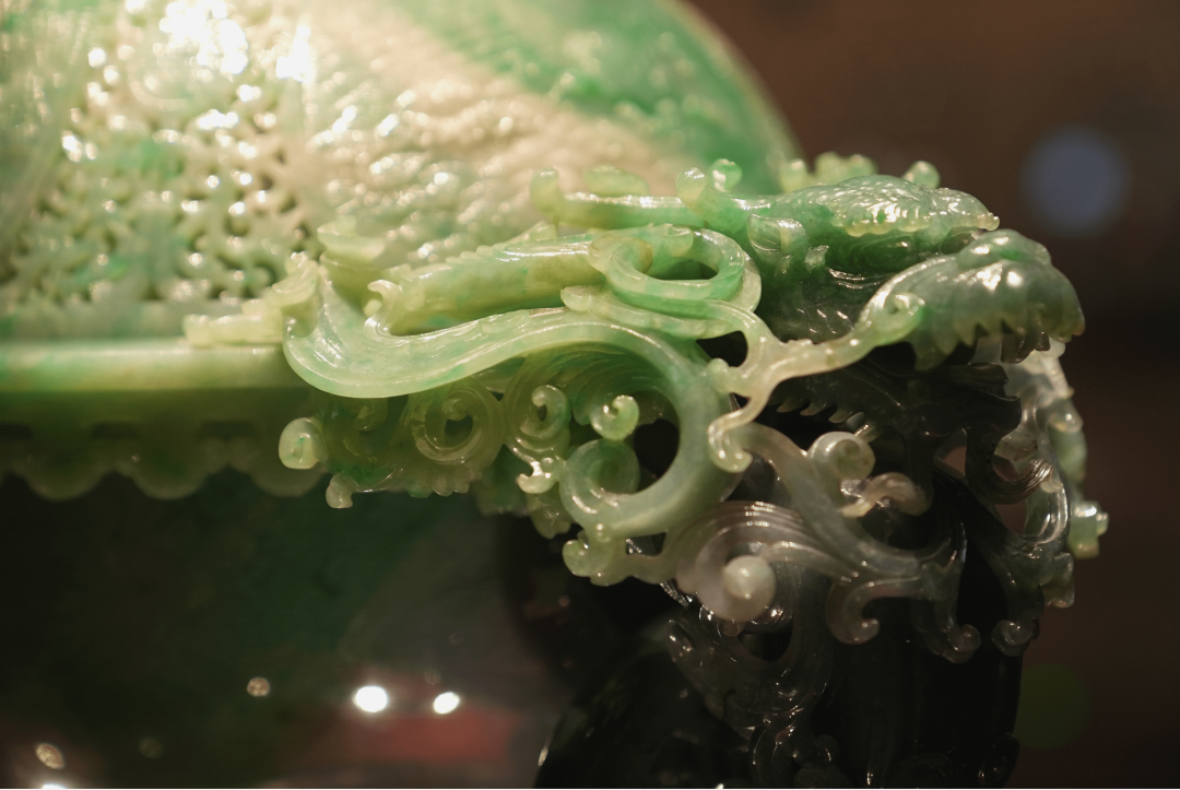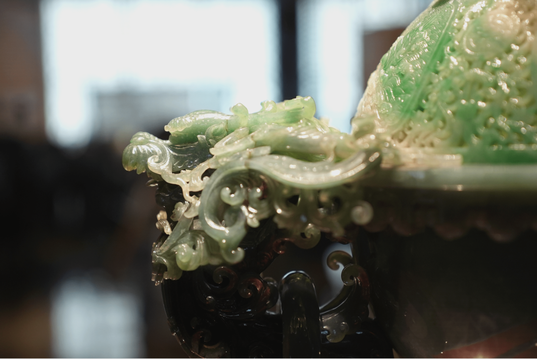 翡翠花薰《含香聚瑞》使用了玉器历史上最高难度的套料工艺,花熏的盖由主身中掏出的料制成,盖中的料则掏出来做了底足。由于中间掏空,内部的绿全部外露,翡翠最漂亮的色彩得以展现,整个花熏因此看起来碧绿晶莹,灿烂夺目。盖、身、底座部分以深浅浮雕的技法装饰青龙、白虎、朱雀、玄武图案,双耳、盖钮则以圆雕的技法雕刻了九龙。