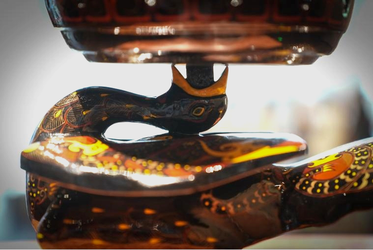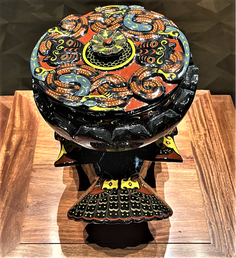 原文物在湖北省荆州市博物馆收藏,这款复制的凤鸟莲花豆由上部的莲花豆盘与下部的凤鸟底座组合而成,中间用鸟头型的构件以榫卯方式连接并用生漆等粘合剂粘牢。盘身上雕刻了一圈共十四片精美的仰瓣莲花浮雕,底座设计成凤鸟展翼腾飞的形态,通体则髹黑漆为地,用红、黄二色彩绘,富丽又不失协调。凤鸟张开的双翅、翘起的尾翼平衡了器物的整体受力,而下部盘卷的蛇身则增大了底座的面积,加强了稳定性,说明当时楚人已能较好地运用物理学中受力平衡原理。因为雕刻得十分精细,各部分拼接的严丝合缝,再加上外表描画了华美的装饰花纹,几乎没人能看出这件器物是组合而成。