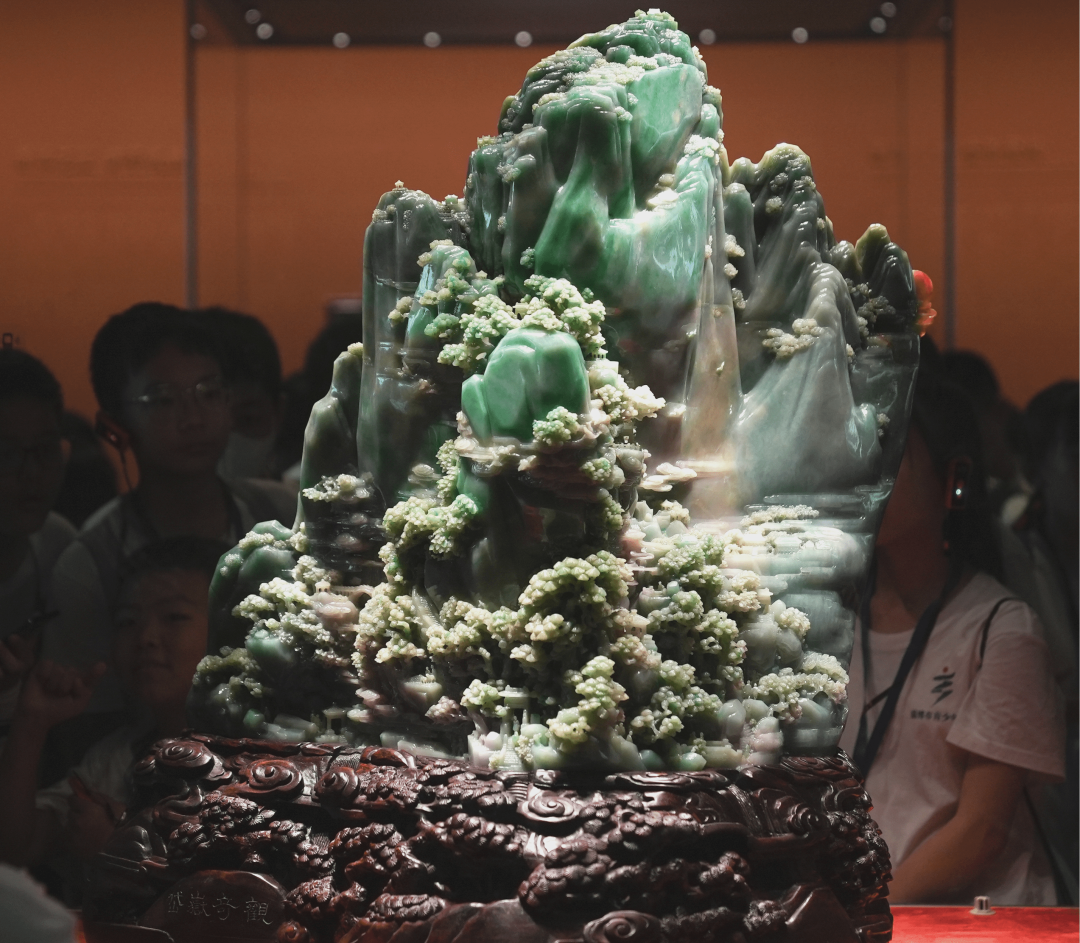 1989 年,由 60 余位大师耗费 8 年心血完成的四件翡翠巨作在京问世,被权威专家评定为“四大国宝”。翡翠山子《岱岳奇观》取材自五岳之首的泰山,制作时因材施艺,正面翡翠色泽翠多而密,为泰山的阳面,雕刻得繁复而细致;背面则呈深沉的油青色,故而为泰山的阴面,雕刻也相对较为简练。山子背面右上侧边缘有一块红棕色翡,艺术家们以俏色技法将其塑造为一轮红日,在山巅之间升起,隐现于云彩之间,是为点睛之笔。