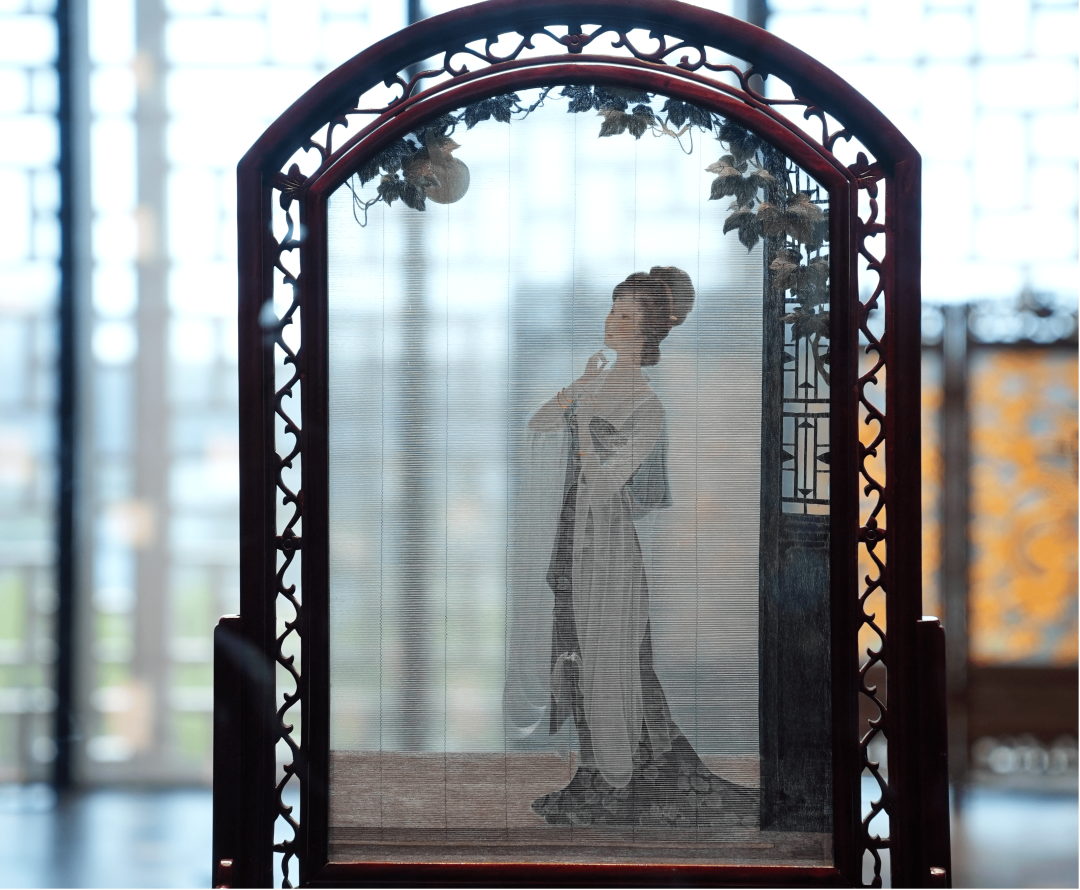 湘绣是我国四大名绣之一,起源于湖南的民间刺绣,是吸取了苏绣和粤绣的优点而发展起来的,至今已有两千多年的历史。《双面异绣·望月》借助湘绣的核心技艺之“双面异绣”巧妙表现出幽邃深远之美,正如《唐诗品汇》的评价:“矜丽素净,自是可人。”