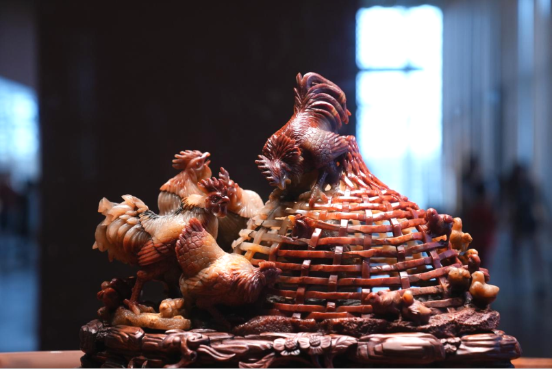 1955 年,福建工艺美术大师陈敬祥从传统技法中,用自己创新的刀具,在 20 多公斤的高山石上,雕出鸡笼内外群鸡共乐的和谐场面,此作初名《鸡笼罩》,1960 年进京展示。著名画家华君武前来观看,见其笼内母鸡扑翅欲出,笼外公鸡跃跃求欢,便当场为其更名为《求偶鸡》,名震京城,一举成名。有人将其赞为“一首石头吟诵的《关雎》,用刻刀演奏的《梁祝》”。