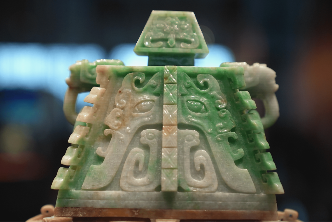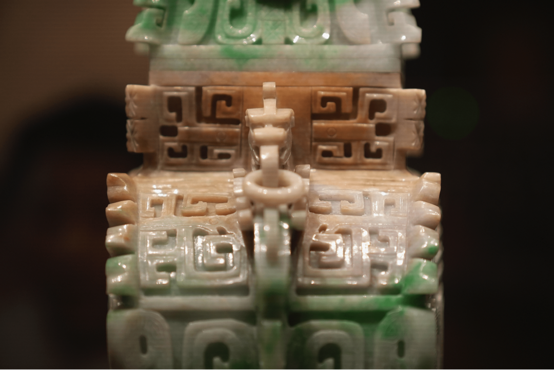 卣(yǒu),通常用来盛“秬鬯(jù chàng)”这一祭祀用的香酒。秬是“黑黍”之义,鬯为一种香草,即郁金,姜科。《诗经•江汉》中有“釐(lài)尔圭瓒,秬鬯一卣”的诗句,意思是“赐你圭瓒以玉为柄,黑黍香酒再赐一卣。”展馆中的碧玉雕刻作品“提梁卣”,其器型仿制的便是商代铜卣。