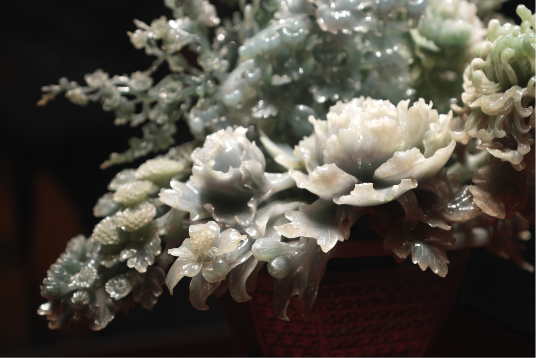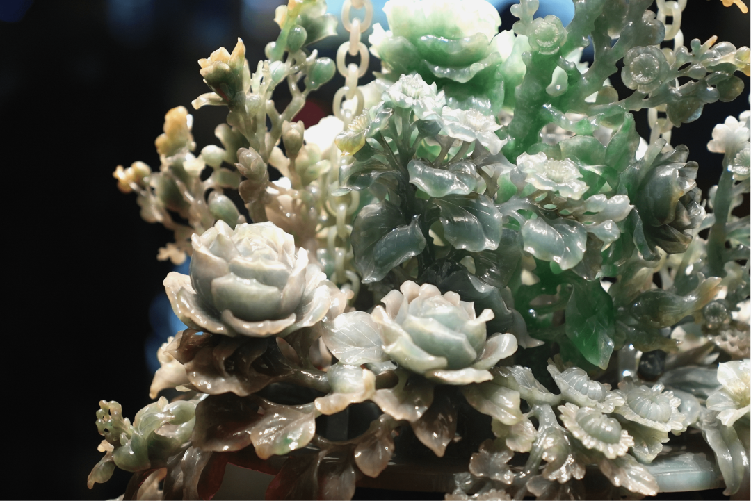 翡翠提梁花篮《群芳揽胜》原料不仅体积小,而且质地和色泽是四块玉中较差的一块,为克服原料天然的缺点,艺术家们使用了掏膛技法,将整块翡翠掏成一个中空的花篮。从篮体中取出的玉料,被雕琢成牡丹、菊花、玉兰、月季等花卉,花朵与枝叶自由穿插,繁茂而自由舒展,保留、突出了翡翠色泽鲜艳、质地好的部分,极富浪漫华丽的艺术气息。另外,用传统套环技法琢出的提梁以及两条各有 32 个环的链子,将作品的高度增加了近一倍,可谓“小料大作”,弥补了原料体积较小的缺憾。