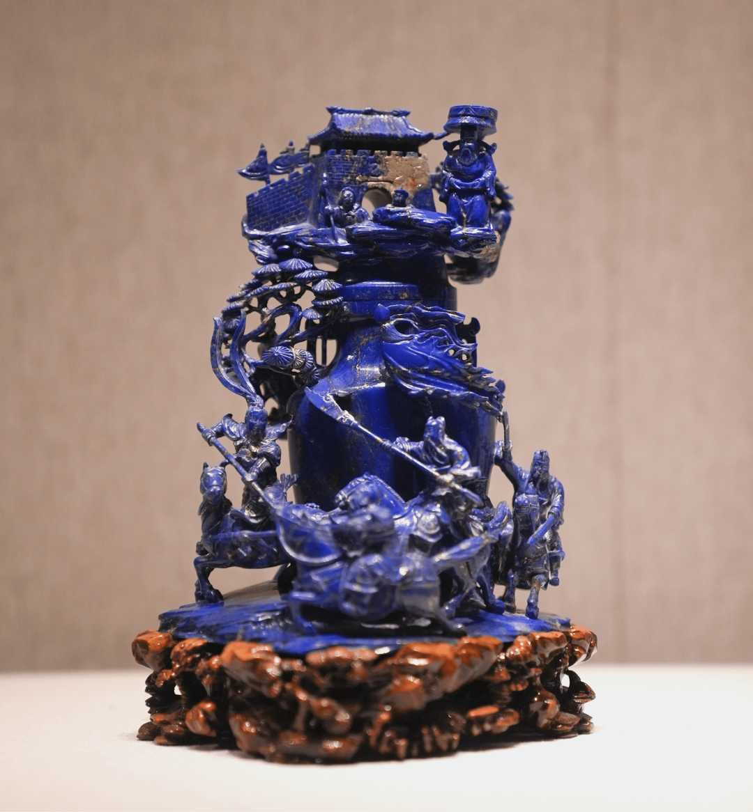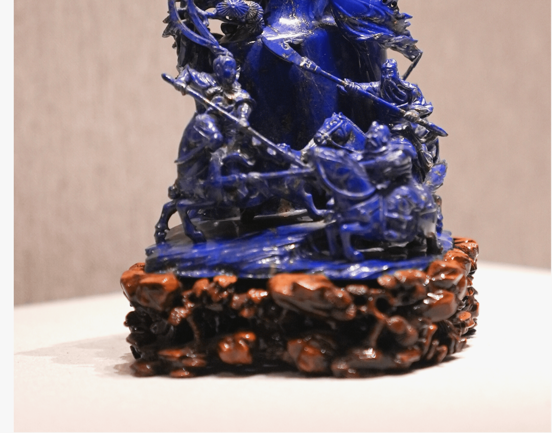 在展厅的众多玉雕中,一个通体湛蓝的玉雕格外吸睛。据讲解员介绍,该材质为青金石,通过“丝绸之路”从阿富汗传入中国,在中国古代被称为璆琳、金精、瑾瑜,青黛等。《石雅》云:“青金石色相如天,或复金屑散乱,光辉灿烂,若众星丽于天也”。所以中国古代通常用青金石作为上天威严崇高的象征。由于青金石玉石“色相如天”,故不论朝珠或朝带,尤受重用。青金石也被阿拉伯国家视为“瑰宝”。另外阿富汗也把它当作自己国家的“国石”。