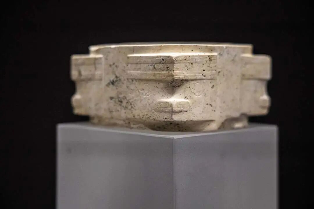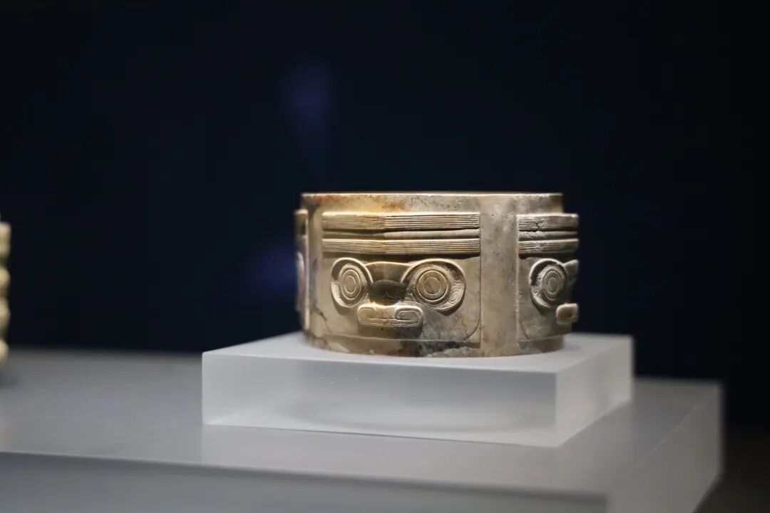 在展览中,我们可以看到高矮方圆形态各异的精美玉琮,它们无一例外,都出现了一个“兽面”的图案,这就是良渚最为著名的“神徽”,刘斌指出,玉琮是“降神的原始宗教法器”,而神徽,则是“玉琮的灵魂”。