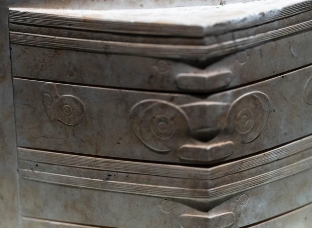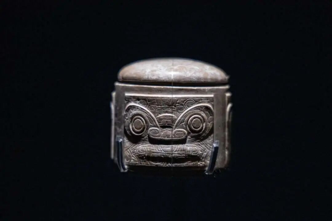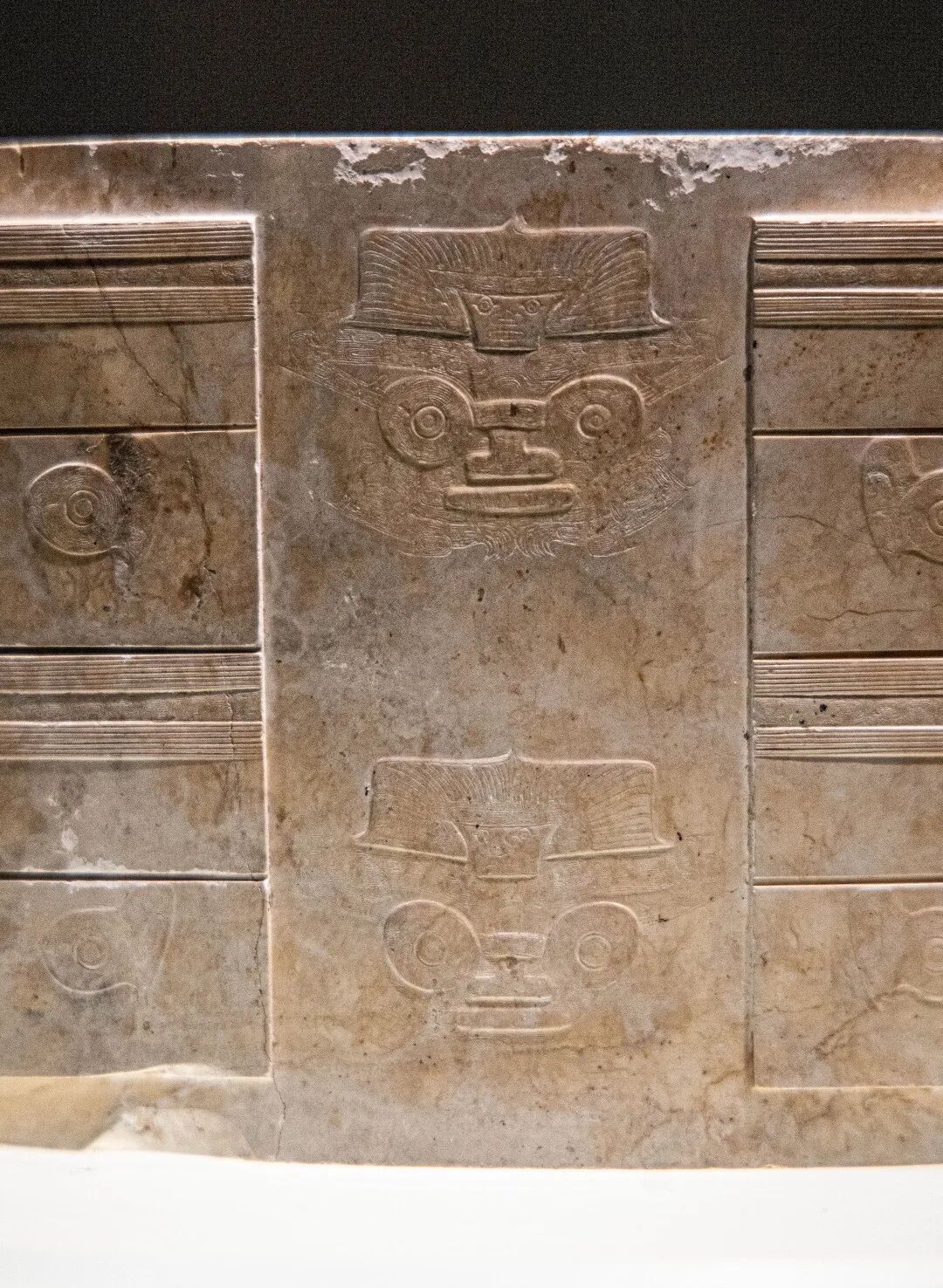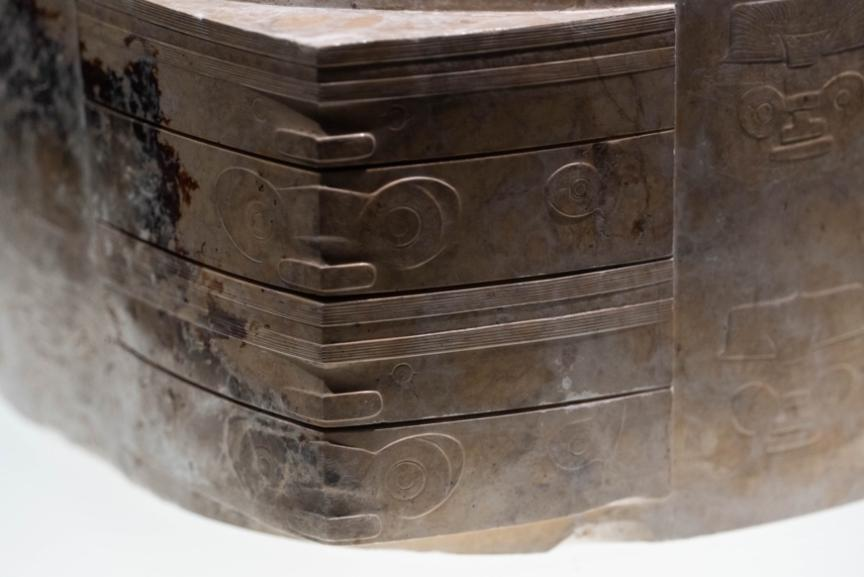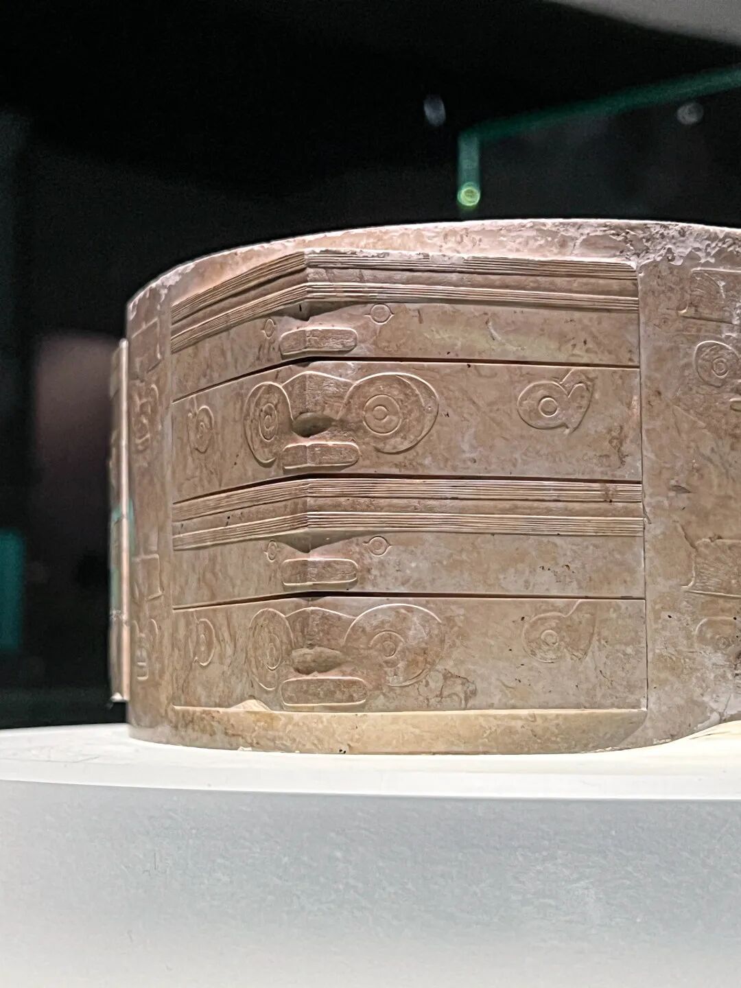 据刘斌回忆,在野外工作阶段,他们也差点漏掉了这“小得如同微雕”的细刻纹样。直到冲洗照片时,团队才惊喜地发现兽面两边不是常见的云雷纹样,而是两只手,这两只手大拇指上翘,“仿佛正扶住那像面具一样的两只大眼睛”,考古队员这才发现了神徽的真面目。不过,浮雕式的神人与神兽,对比阴刻的四肢,似乎本身就代表中一种突出关系。换言之,神所展示给大众的是威严恐怖的面孔,完满的全身其他细节显然不是为让所有人看到的部分。