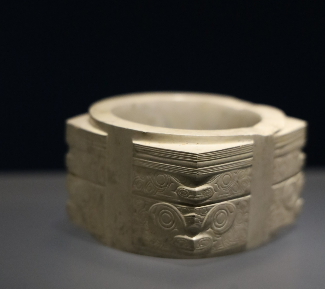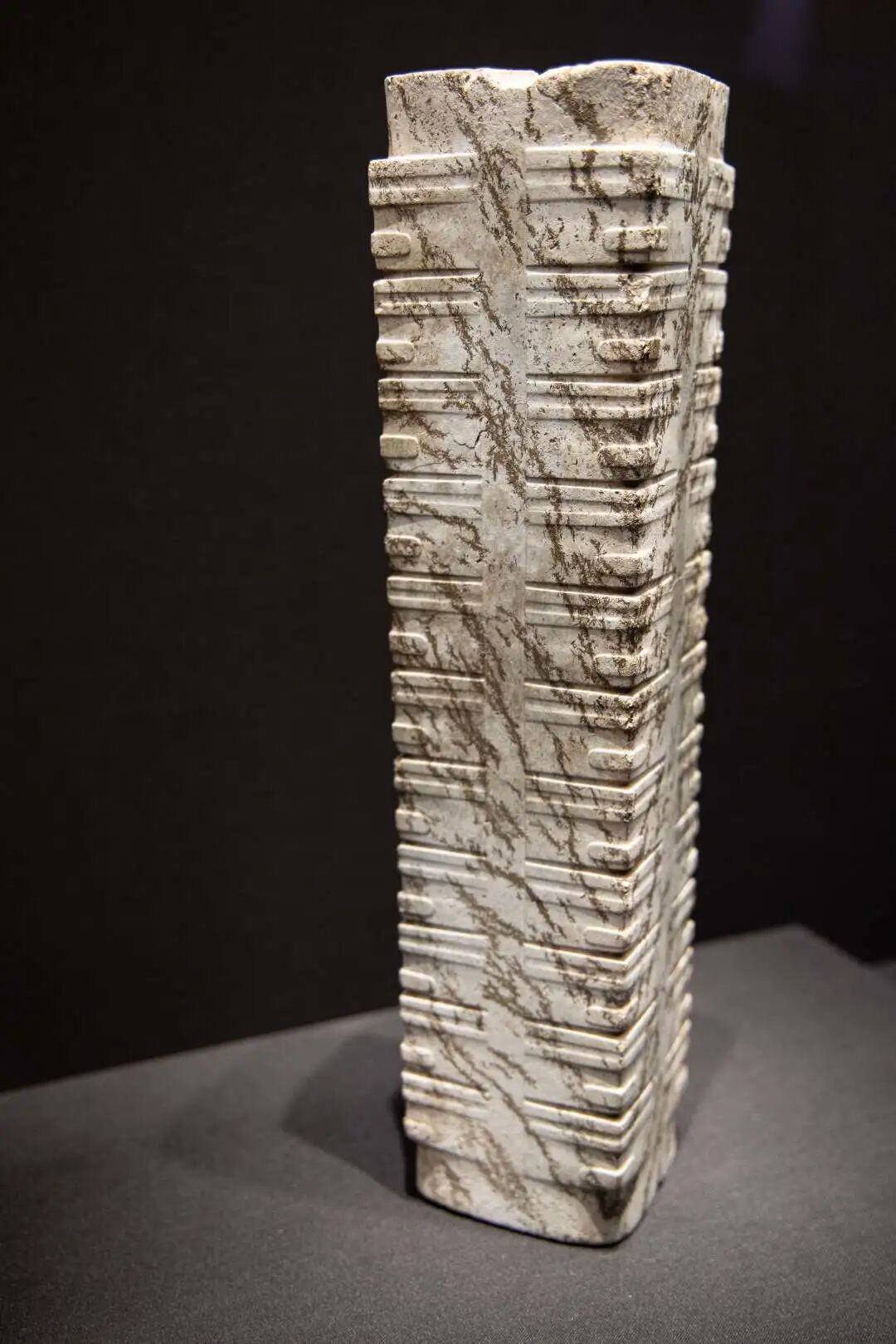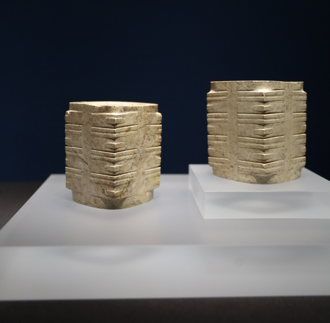 中国古代对于宇宙的认识是“天圆地方”,方形玉琮以四面八方的“实”,向心环绕中空的“虚”,圆空的中心上通天宇,象征通天的神柱,是良渚人对于沟通天地的渴望与理想。