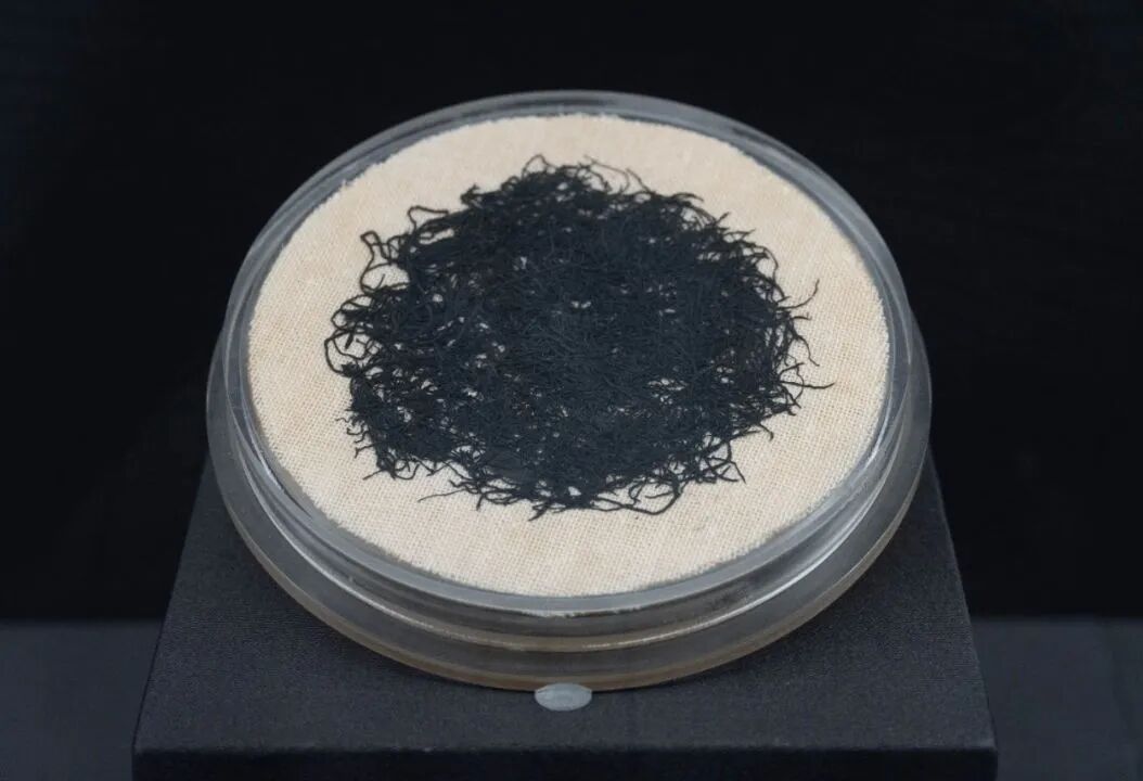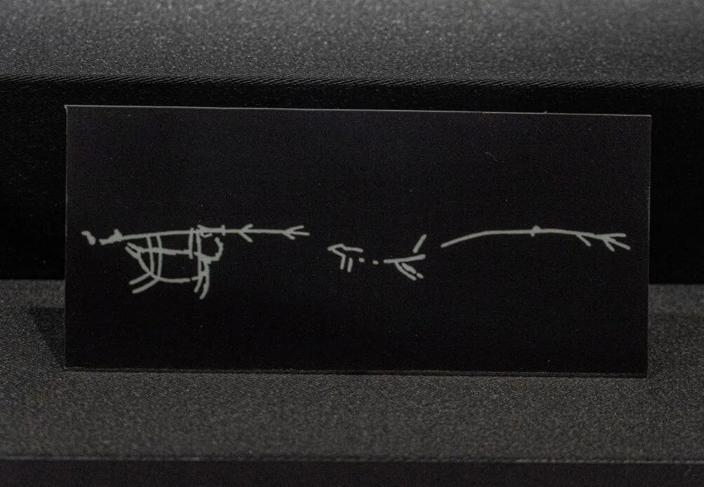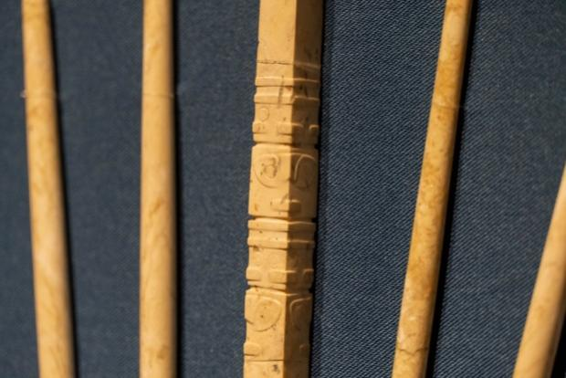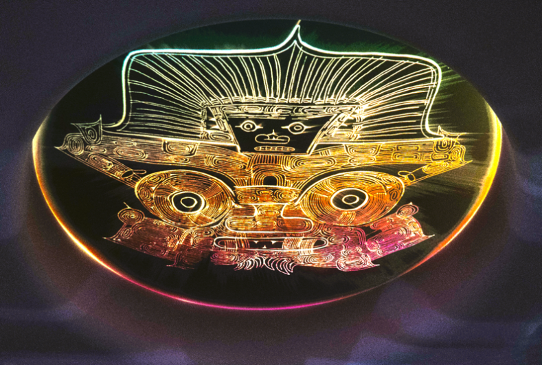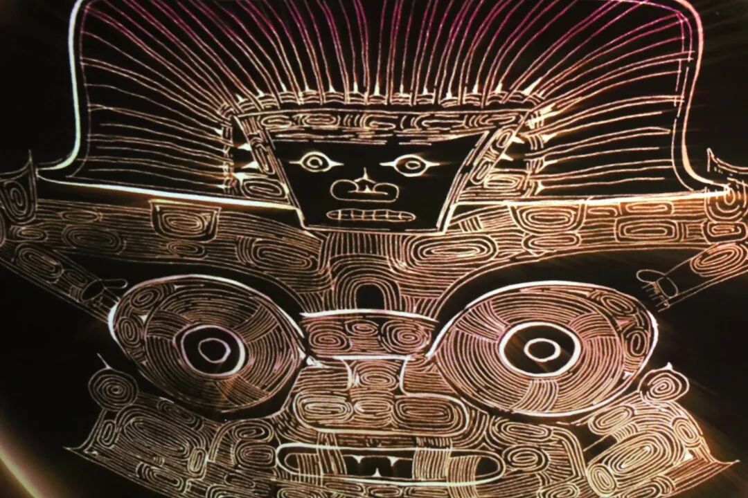 展览厅天花板灯光神徽,光线打在千年后同样刻有神徽的象牙权杖上,象征着跨越时空的不变认同。