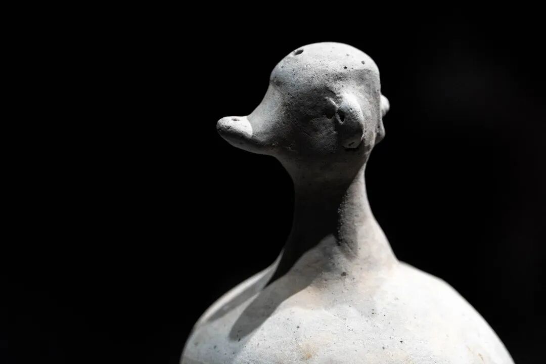 在神徽旁,左右还各刻了一只飞鸟,和神人构成了复合渲染的图像。鸟身上的“大眼睛”,与神徽眼部的构图基本一致,在鸟身上的圆圈,应该是神眼的象征,颇具神秘色彩,俨然是良渚神的另一化身。这双神眼,早已出现在河姆渡的大象、猪等动物身上,代表着万物有灵的信仰,玉鸟和神徽也继承了这种魔力。