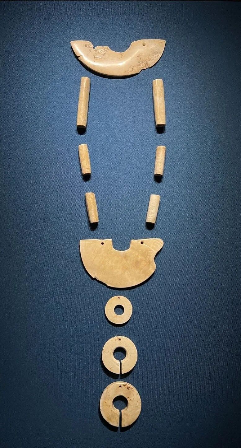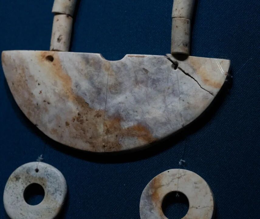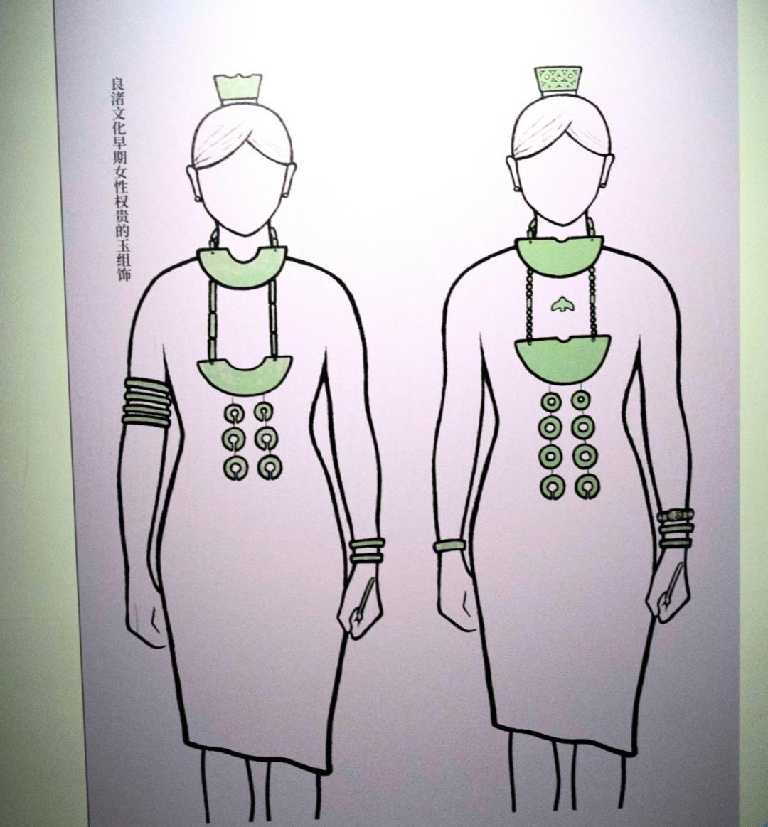 玉璜与女性的关系,在崧泽时期已经相当明显,也代表着女性较高的权力。到了良渚时期女性墓葬玉器比例的缩减,也代表着男性已经占据了主体地位,但女性仍旧占有一席之地。图中的玉组饰就是良渚女性佩戴的形象。到了良渚文化末期,女性和玉璜的组合则更加少见。