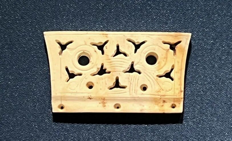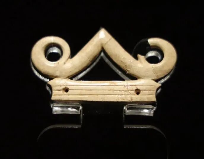 再比如这件玉冠状器,就有着明晰的纹样,它的命名本身就是因为其形状很像神徽中人戴的神冠。在这一器物中,整体构图还是和琮王完整的图案一样,只不过神灵更有“隐现”感,特化的面(凸出的阳刻)都通过透雕的形式表现了。无论是工艺的变化还是简化,良渚的神王以一种固定的姿态降临在每一件器物上,彰显神力。