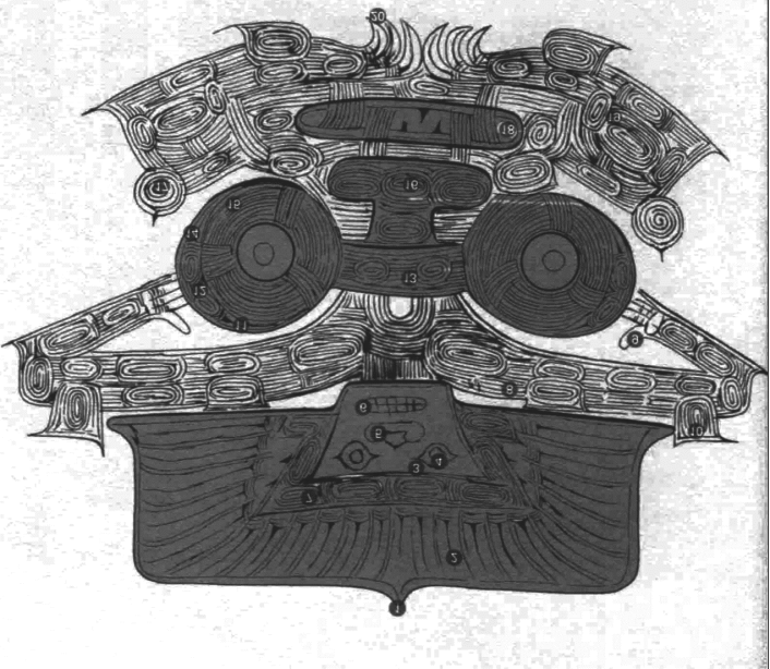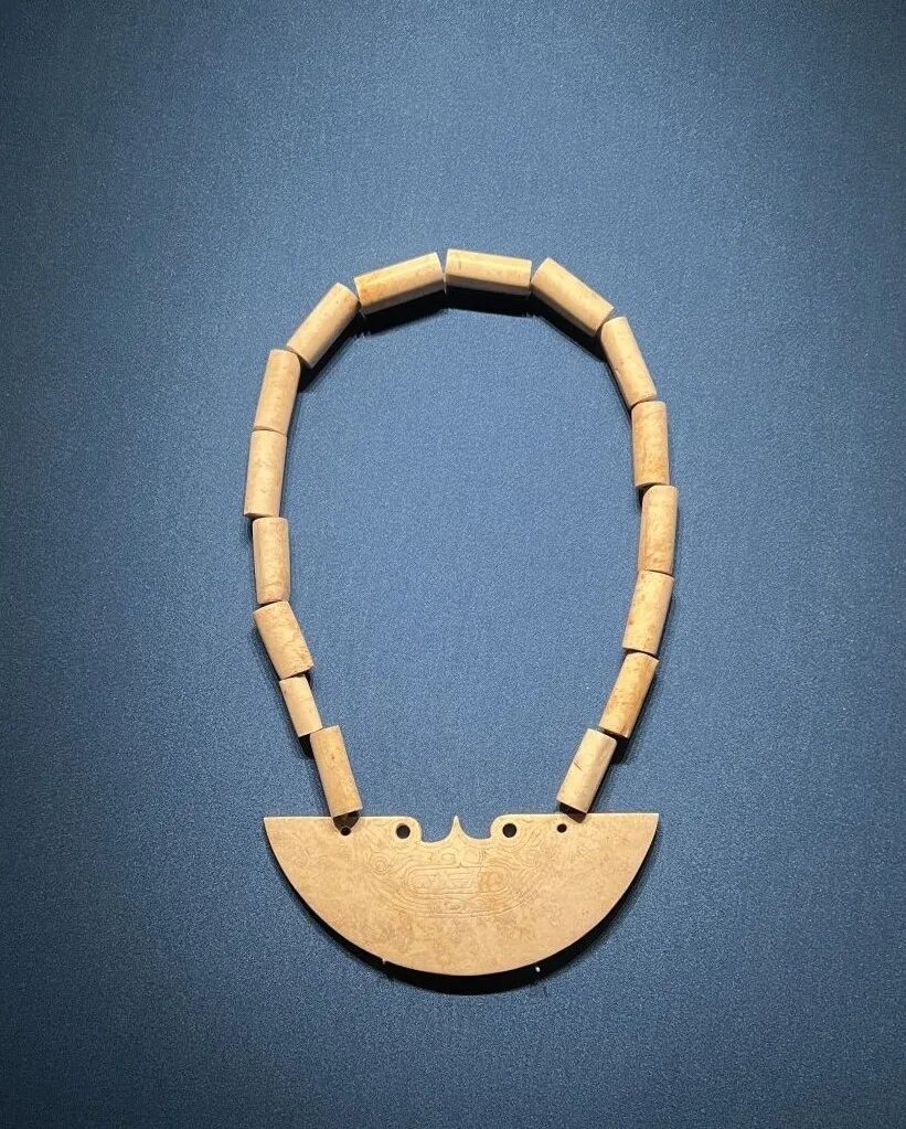 玉璜的身上一般都只有两个穿孔,出土时往往位于胸部,凹面朝上,像“坑”一样。在良渚时期的玉璜,一般都是半个玉璧的大小(商周就缩到 1/3 个圆了),而且成组出现。如果按照图示中的佩戴方式,很难不把这样的器具视作纯粹权贵的礼器,关注背后绝对的权力。