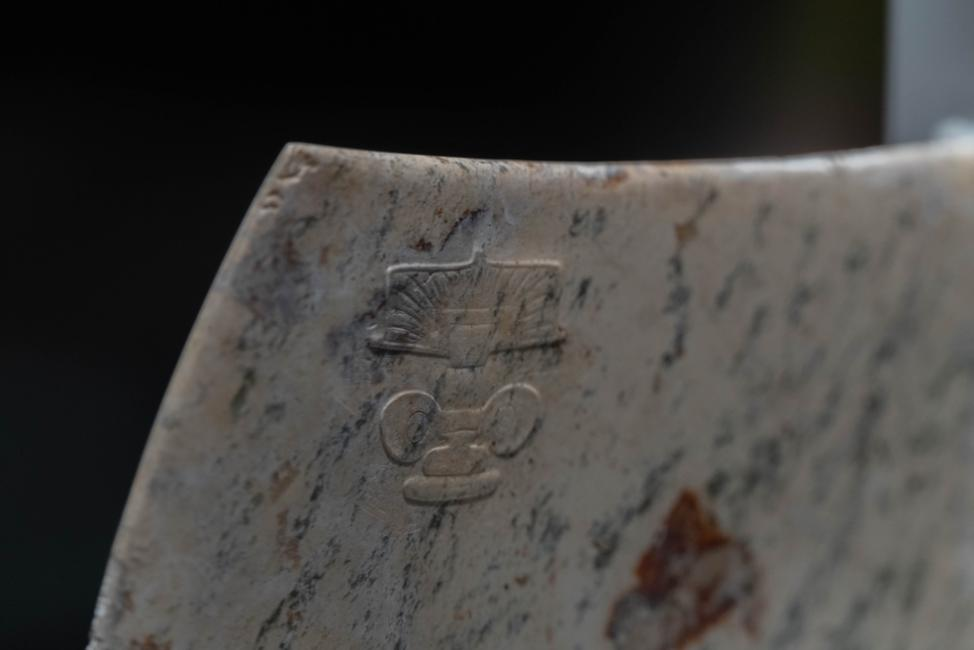 崧泽王石钺的发现,展示了军权与王权的初步结合,而良渚最为至尊的器具——玉钺则象征着军权完全向仪式性的王权转变,再加上神徽相佑,更是披上了神权的色彩。这件瑁镦组合玉钺是由主体的玉钺,底部的玉镦以及端部的玉瑁组合而成,柄则腐蚀不存,钺身上刻有神徽,可以说这件器物代表着至高无上的权力。这件展品本身也和“琮王”并列本次展览的“神器”。