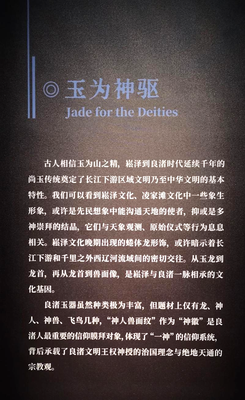 五千多年前,长江下游地区先民创造出的辉煌文明,将在这一展览中一一呈现。长江下游环太湖流域的文明化历程有着清晰的序列,从公元前 5000 年到公元前 2000 年,先后经历了马家浜文化(公元前 5000-4000)、崧泽文化(公元前 4000-3300)、良渚文化(公元前 3300-2300)、钱山漾文化(公元前 2300-2100)和广富林文化(公元前 2100-1800)等发展阶段。这一时期,在聚落的不断竞争与整合中,东亚最早的国家社会良渚文明最终形成,在展览中奏响“信仰与权力”的二重奏。
