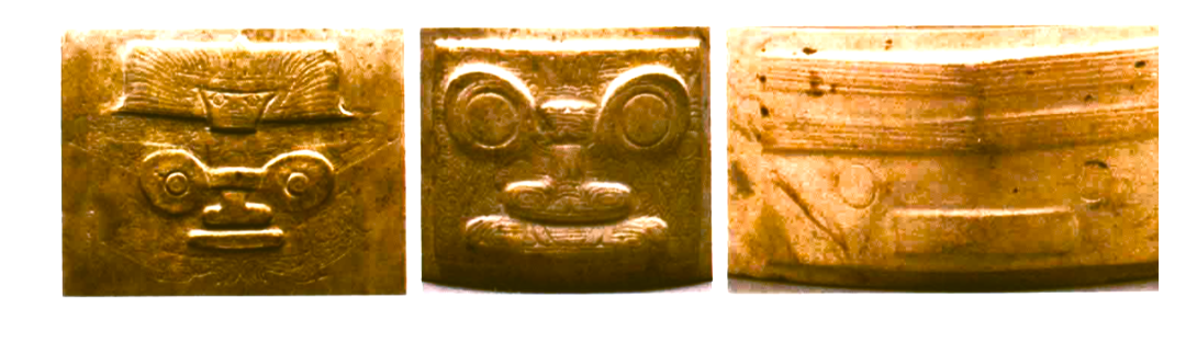 “琮王”上之完整神徽(左);瑶山兽面纹镯式琮及纹饰细部(中);反山玉琮纹饰细部(右)