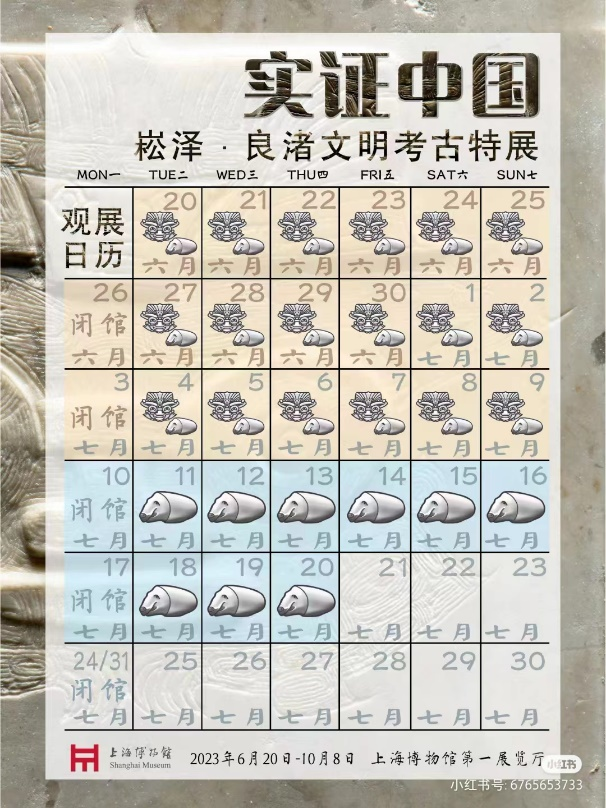 注意“实证中国”的观展日历,三大神器“玉琮”、“神人兽面纹瑁镦组合玉钺”、“瑁镦组合玉权杖”首次齐聚上海,展览日期为 6 月 20 日-7 月 20 日。