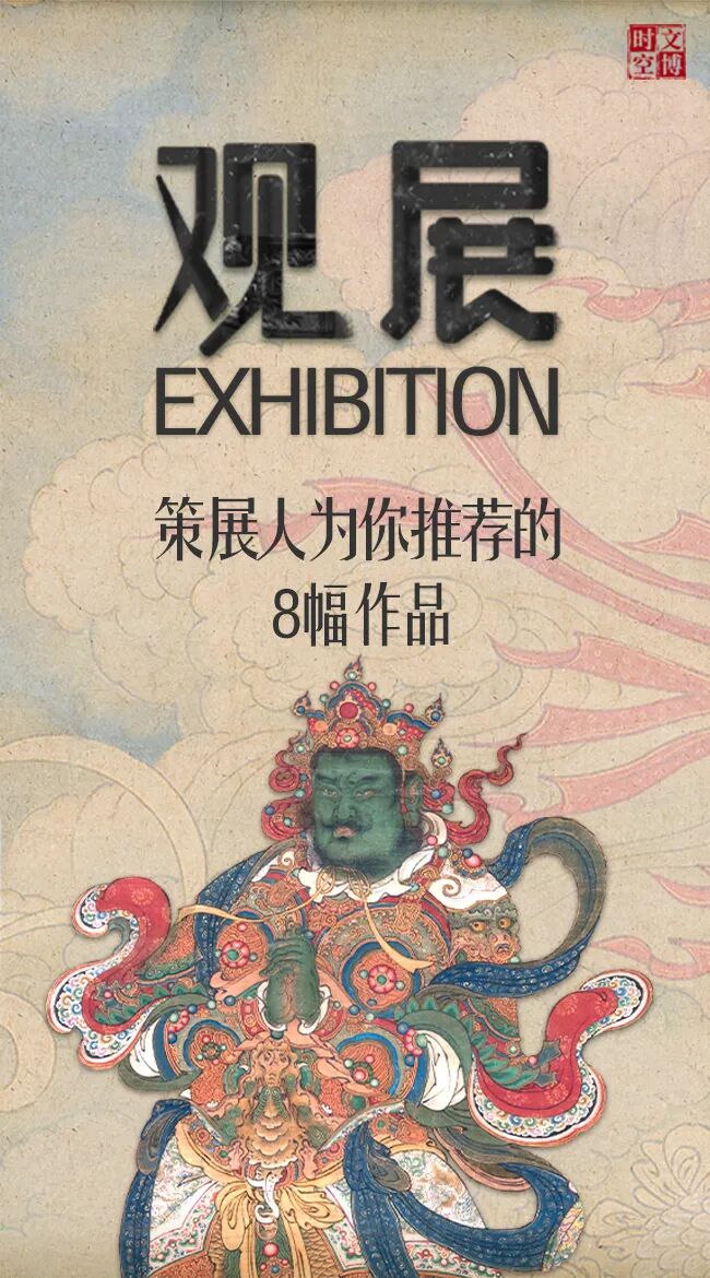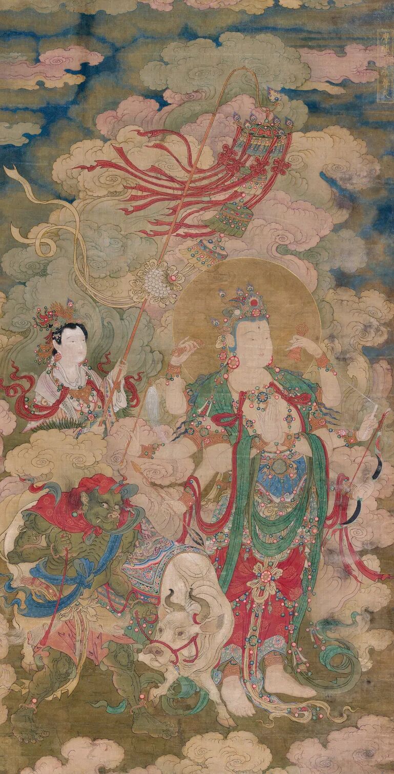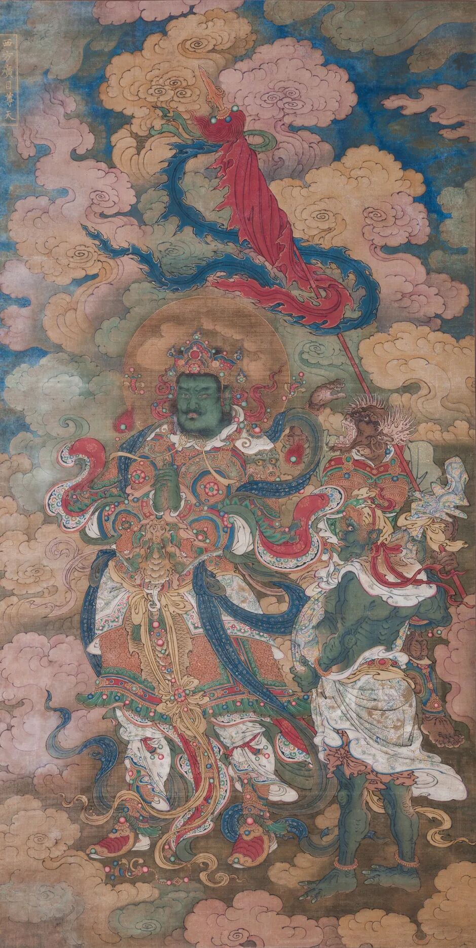 这一幅我个人认为是我们馆藏道释人物画像里面艺术水准最高的一幅,所以我们也把它作为这次展览海报的主题。摩醯首罗天其实是印度教三大主神之一的湿婆神,它进入到佛教体系中后,成为了佛教二十诸天之一。像底下这个白牛,是湿婆神的坐骑,就是白牛难敌,这个图像志进入到佛教体系以后也保留下来了。这个人物的造型,还有后面给他撑幡的侍女,可以和山西宝宁寺的水陆画做一个对比,也可以和北京法海寺的壁画做对比,你会发现造型非常相近。旁边这幅西方广目尊天像也是,风格、人物造型、用色与法海寺完全一致。我个人认为是同一批工匠绘制而成。