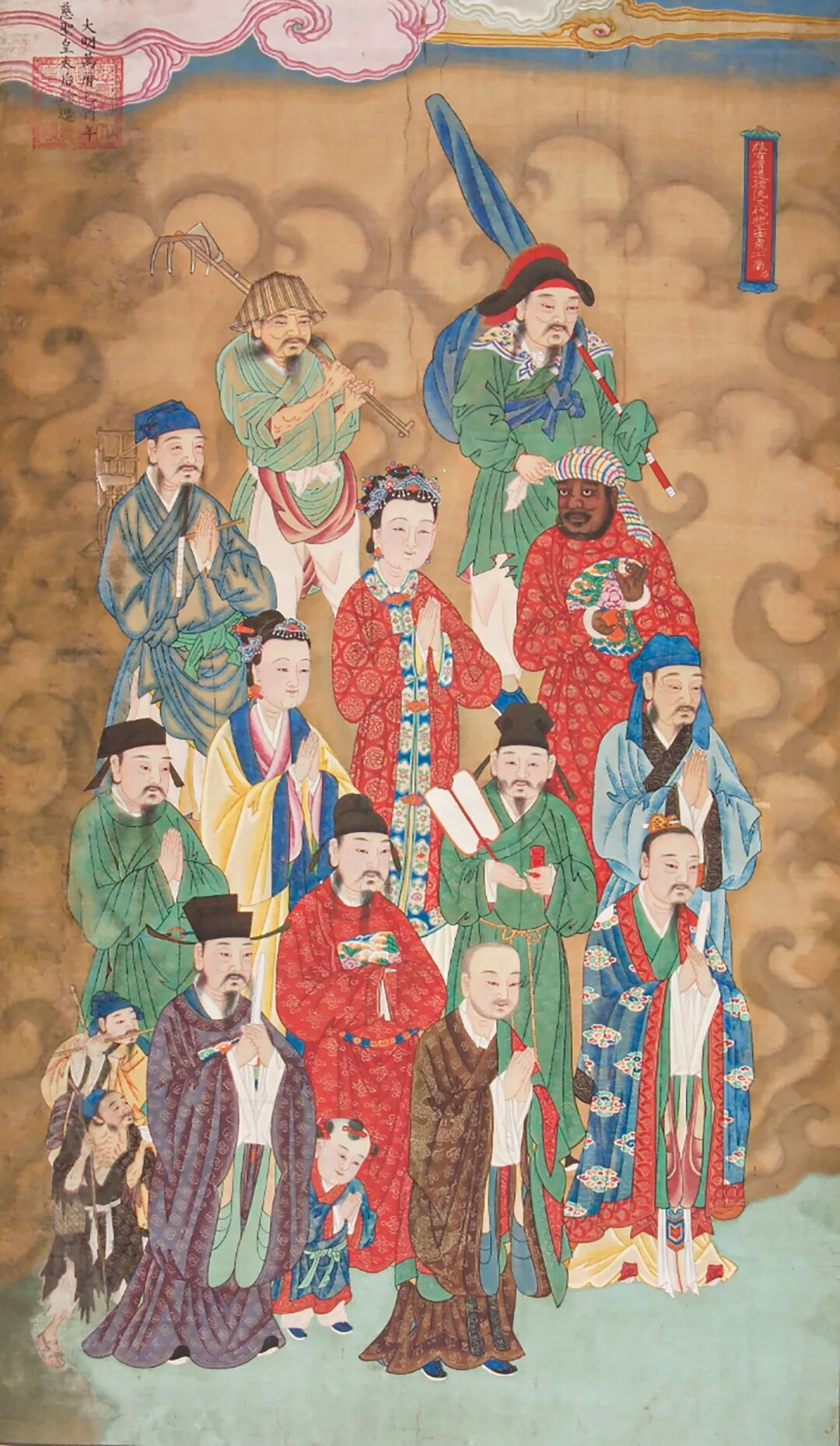 这一幅是水陆画中往古人伦(注:佛教用语,指的是水陆法会中被超度对象中的一部分孤魂)题材,画了社会各阶层人物。从前往后,地位依次降低,最前面画的僧人、道士儒生,后面有官员和命妇。再往后,这个拿规矩的,应该是木工,扛农具的这一位是农夫,扛着伞背着包袱的是走商,下面这个脸部比较黑的,应该是外域到大明王朝的外交官之类。角落里画的比较小的,可能就是九流里面吹拉弹唱的优伶。