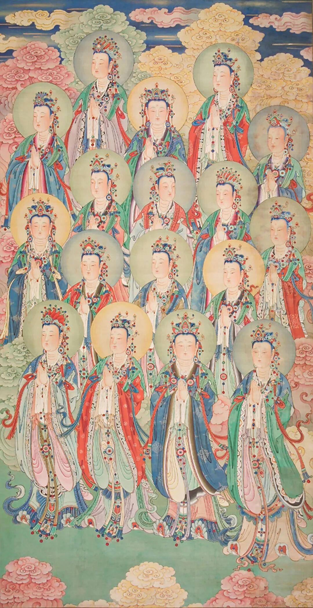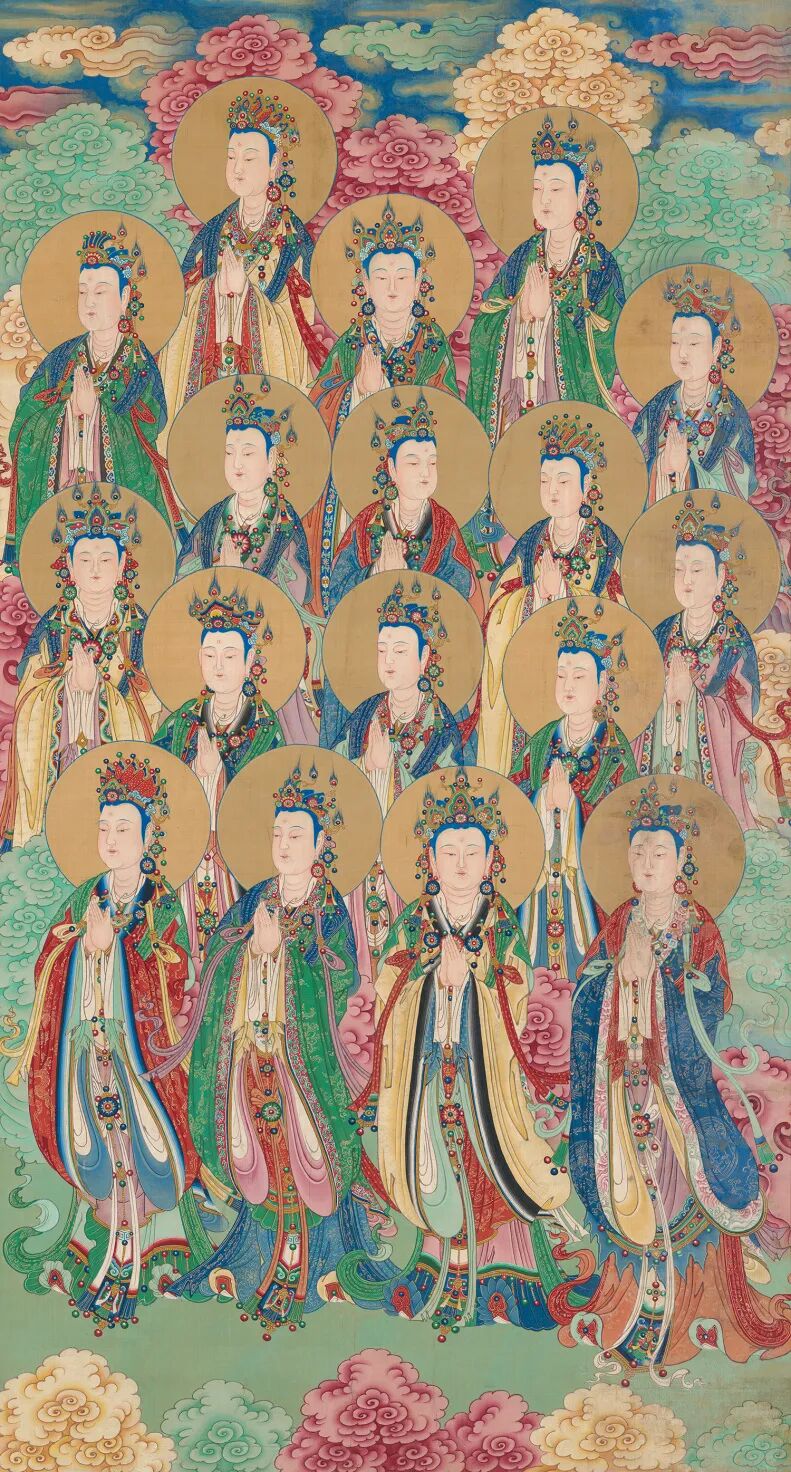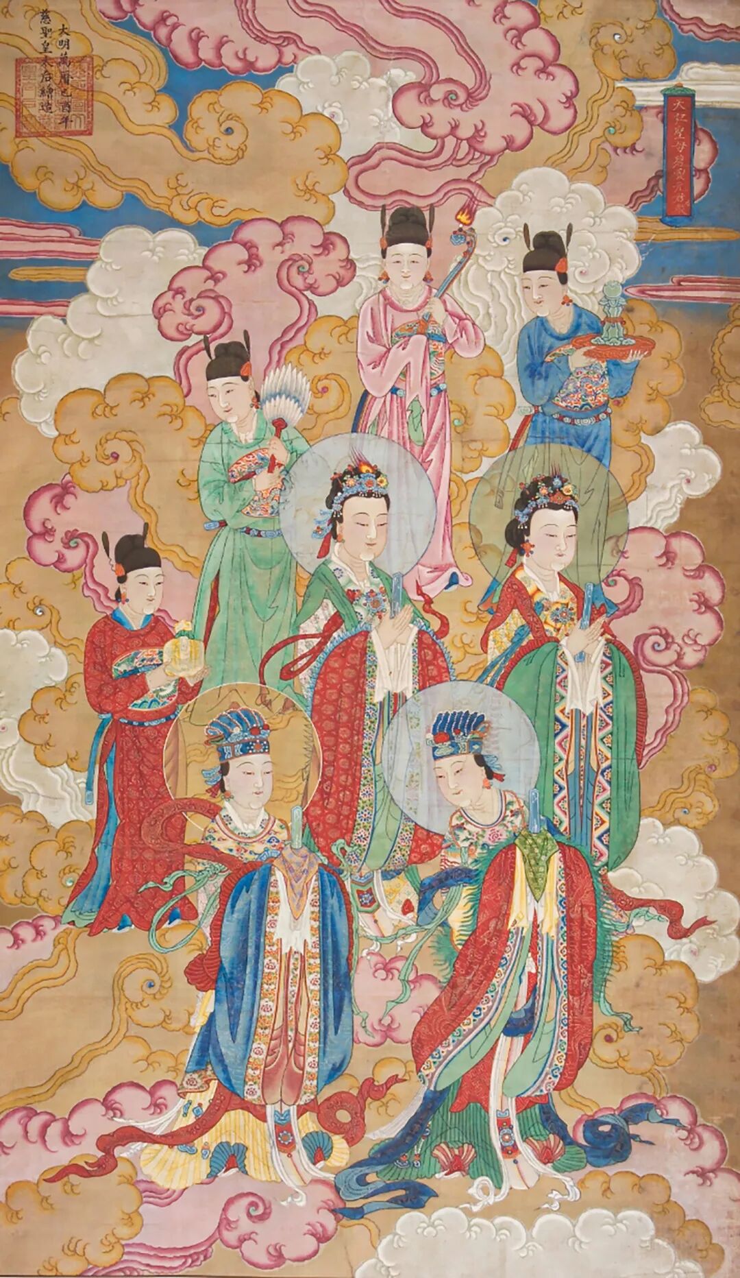 这两幅作品名字都一样,画的都是色界十七天,人物的排布、头冠与装饰、服饰风格完全一样,背后的云气纹略有不同,但大体风格一致。这就是同一个粉本在不同的时期,不同画工手里流传的直观体现。从作画风格判断,右侧画作的创作时间略晚于另一幅。它的色彩更鲜艳,人物的妆容偏近于晕酡妆,年画味重一些。