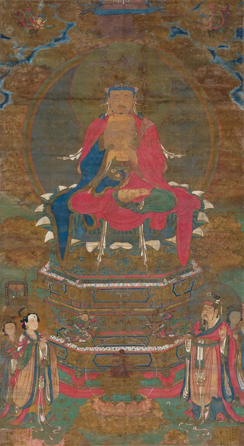 毗卢遮那佛又称大日如来。是密宗最高的尊奉对象,是佛教所说的理性和智慧的集中体现。这幅画中毗卢遮那佛呈男相,唇上有胡须,莲台上外翻较多的莲瓣,这个形象与山西稷山县青龙寺、兴化寺等元代壁画比较相似,判断是明代早期绘制的作品。