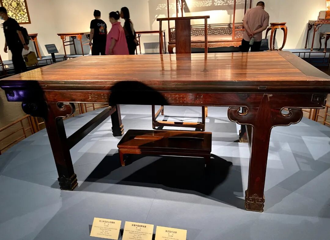 观众一走进上博明清家具馆,目光必然被展厅正中央摆放的那件紫檀插件榫大画案所吸引。这件家具确实是大有来头。从工艺上来看,它通体光素,牙条、腿足边缘微起灯草线,足端略施雕饰,简练明畅。这件享誉中外的画案以极为珍稀的紫檀木制成,用料十分阔绰。由于尺寸宽大,故采用可装可卸的做法,11个精巧的构件通过榫卯结构组成完整的大案。