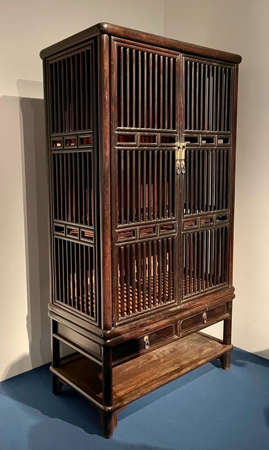 另一件珍贵的紫檀家具,是展厅东侧的紫檀直棂架格。类似的架格过去俗称“气死猫”,是民间用的通风食橱,此类用上好紫檀木制成的考究之物,应是用来摆放图书和文玩的。这件架格上部分三层,后背装板,三面设直棂,下部有几座,设抽屉两格。主体采用独到的“圆包圆”形式,将木材外削为圆,内藏方形榫接结构,工艺精绝,造型整饬圆融,美不外露。