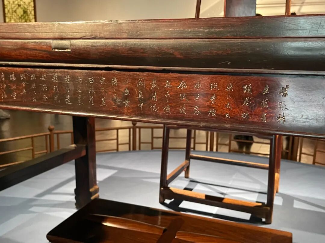 更可宝贵的是,在此案的牙条(面框下面连接两腿之间的部件)正中镌有光绪丁未(1907 年)清宗室溥侗的题识:“昔张叔未藏有项墨林棐几、周公瑕紫檀坐具,制铭赋诗锲其上,备载《清仪阁集》中。此画案得之商丘宋氏,盖西陂旧物也。曩哲留遗,精雅完好,与墨林棐几、公瑕坐具,并堪珍重,摩挲拂拭,私幸于吾有夙缘。用题数语,以志景仰。丁未秋日,西园嬾侗识。”西陂是清初名臣宋荦的号,康熙帝赞他是“清廉为天下巡抚第一”。溥侗本人是京剧名票,著名“民国四公子”之一。此案制作古雅,敦朴端重,且出自名门望族之家,向来被推为天下第一紫檀画案。