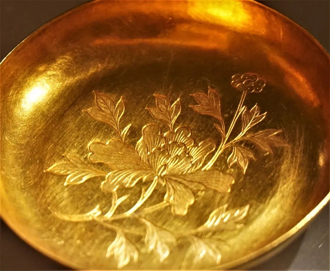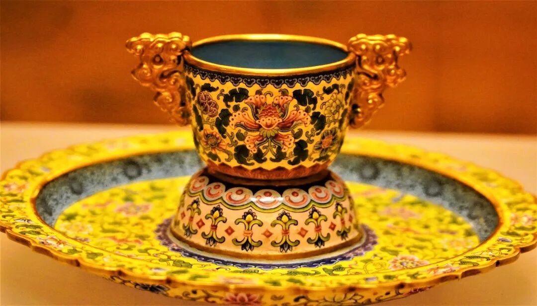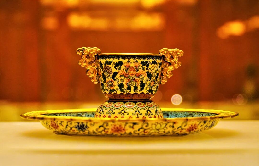 宫廷筵宴重在仪式,杯盘成为行礼如仪不可或缺的道具。金胎画珐琅花卉纹杯盘作为一级展品,以高纯度黄金为胎体,外着珐琅彩绘。珐琅在清代宫廷是重要的创新工艺,珐琅彩颜料附着力不强,工艺难度较大,烧造量稀少,传世品更为罕见,备受康雍乾三位帝王钟爱。