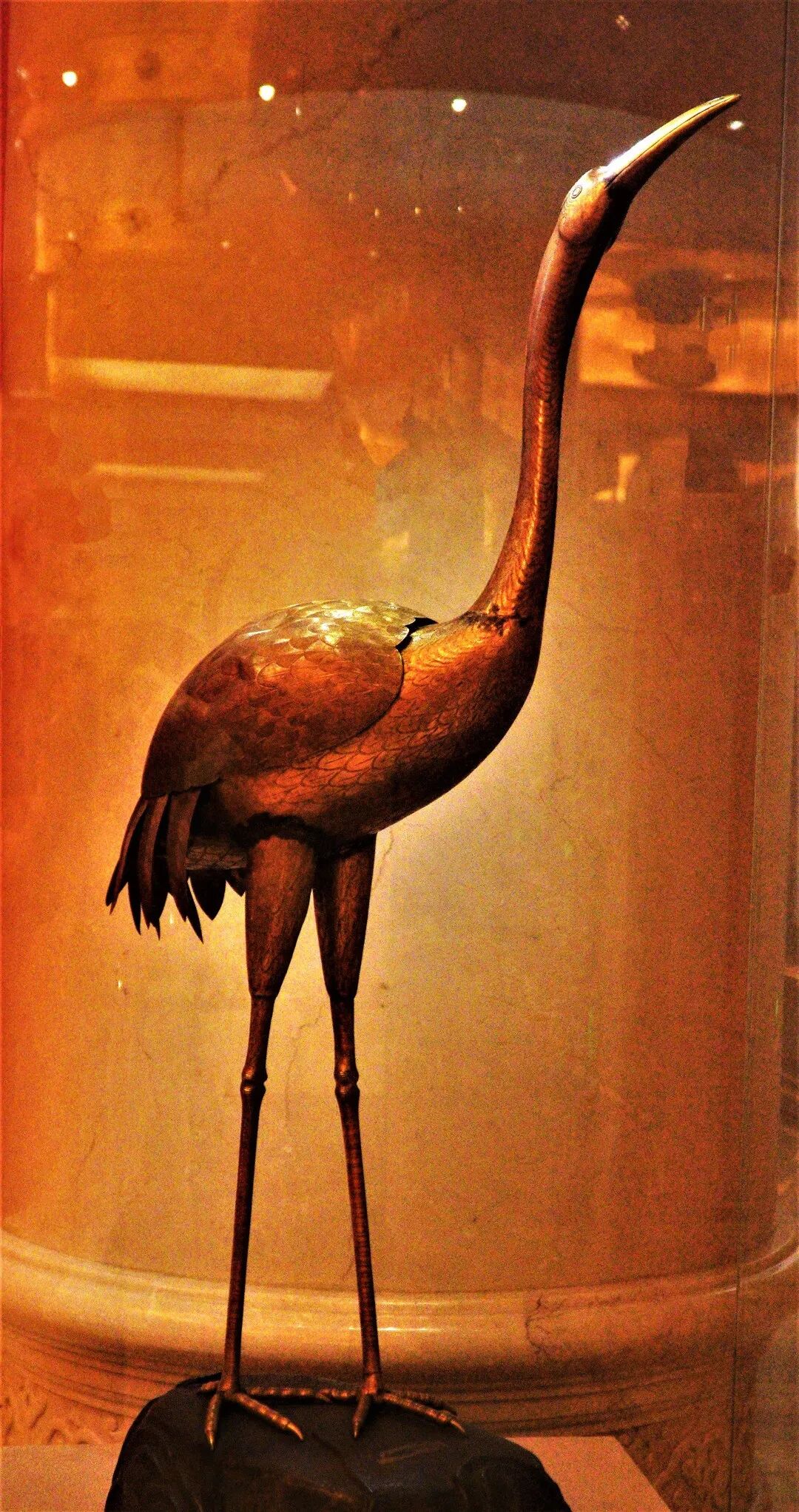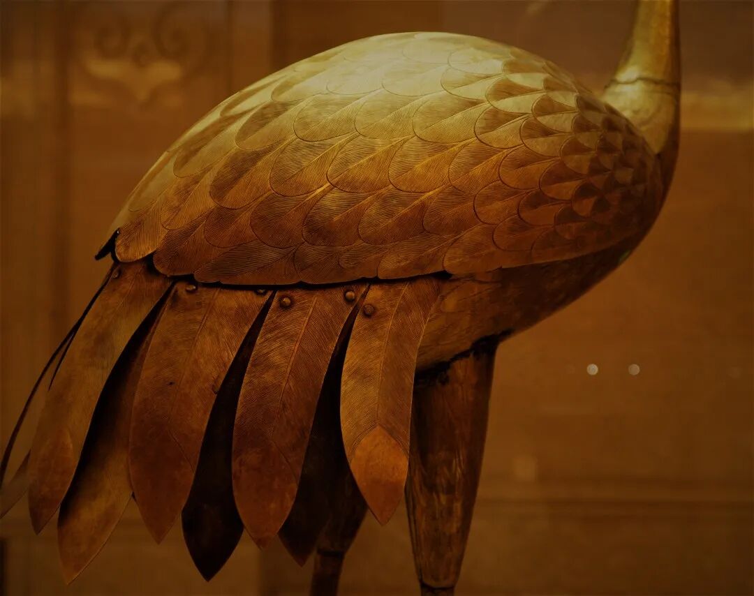 金银香器也是重要的礼器陈设。清宫旧藏金鹤香薰,左右两个金鹤遥相呼应,构成一对。鹤腹内中空用以储存香料,一对翅膀形成上盖,鹤爪下端经榫卯结构嵌入铅质底座,底座四面形似起伏的山峦,呼应金鹤昂首腾云之势,焚香时香气可经高处的鹤喙徐徐散发,取“鹤鸣九皋”之意。