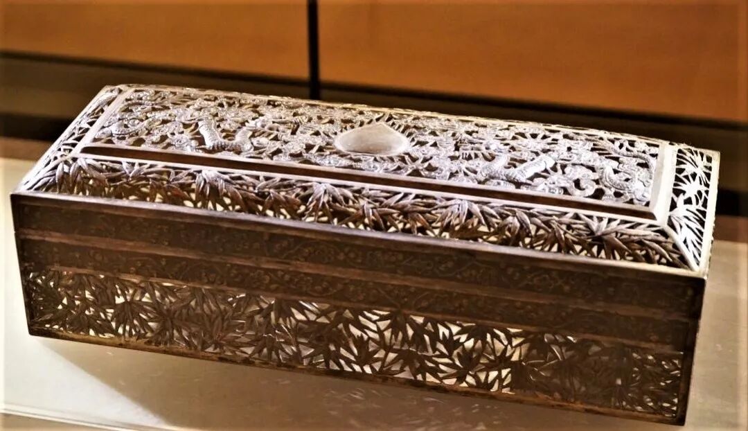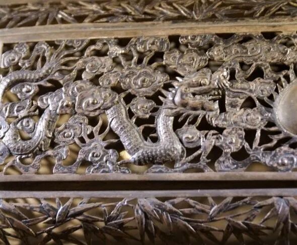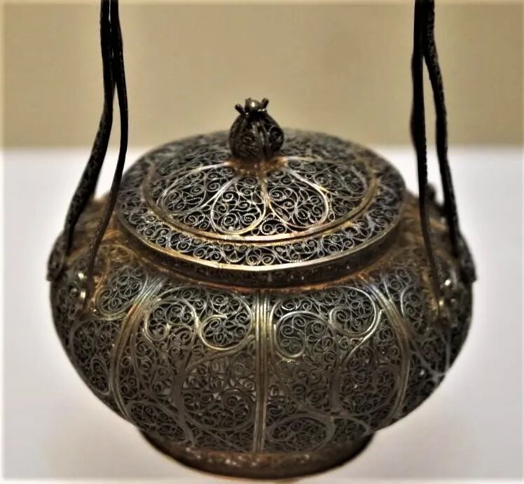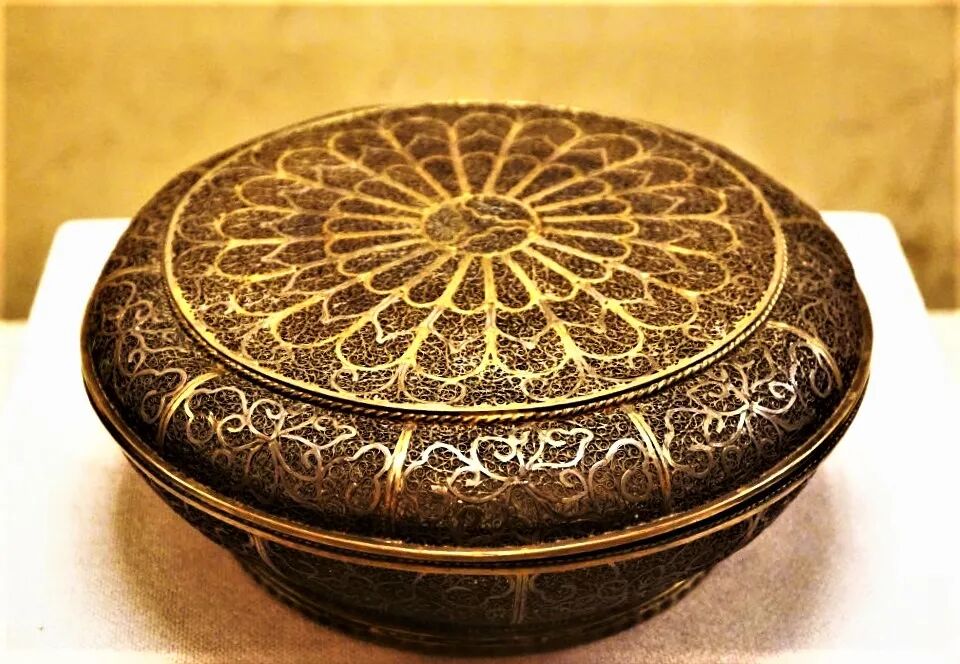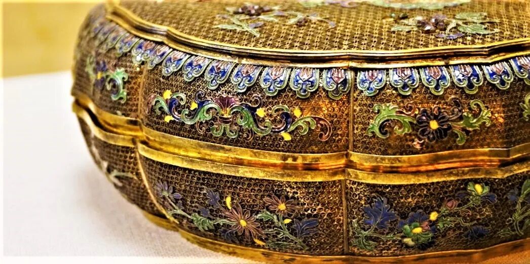 银累丝圆盒与上文银累丝花篮工艺相似,兼具实用意义与艺术价值。