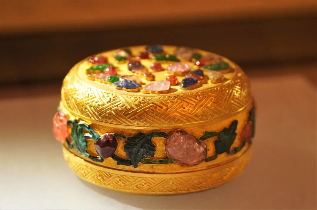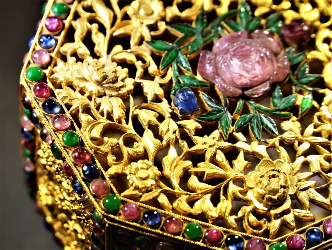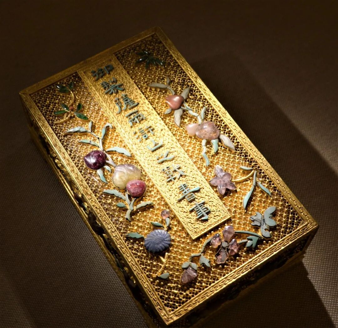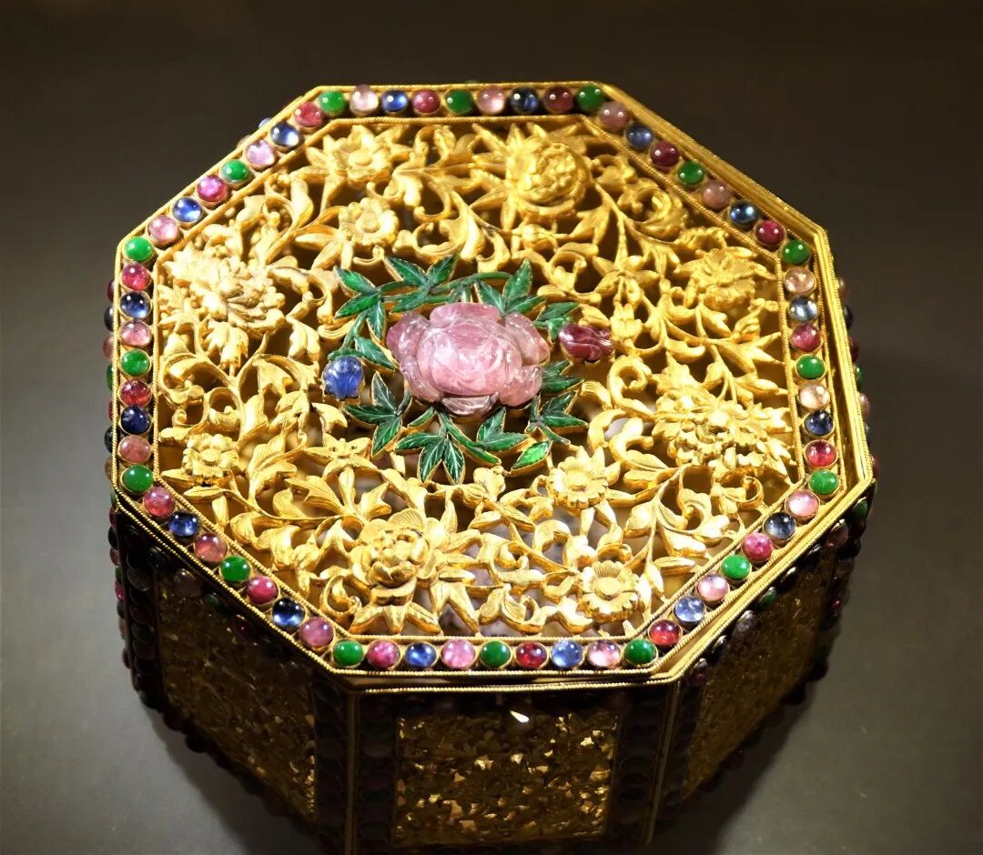 清代清代金银器中不可忽略的一类,是匣与盒。出自广州工匠的金镂花嵌宝八角盒为平面式盖,盒壁如同相连的八扇镂花窗。盒子通体镂雕、錾刻花卉纹,中心为碧玺雕牡丹花、翡翠叶、周边嵌红、蓝宝石、翡翠、碧玺,镶嵌各种宝石共计 318 块,金碧璀璨、十分夺目。
