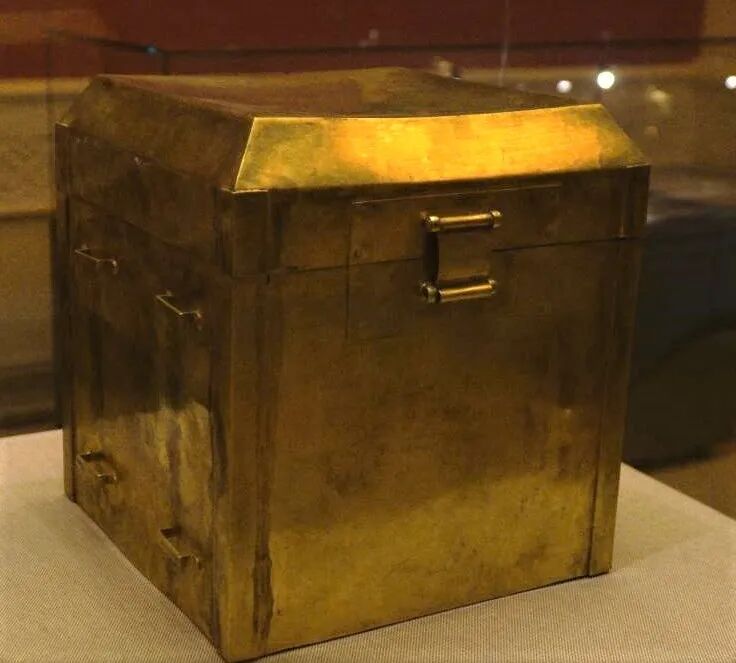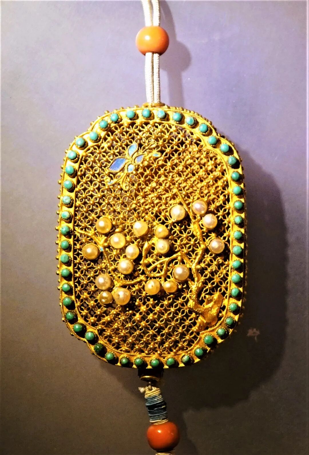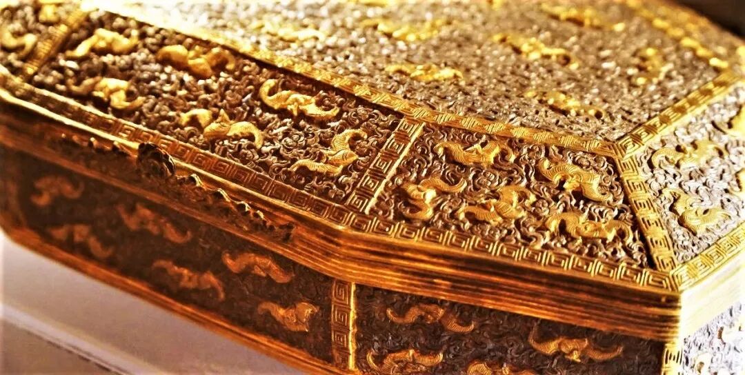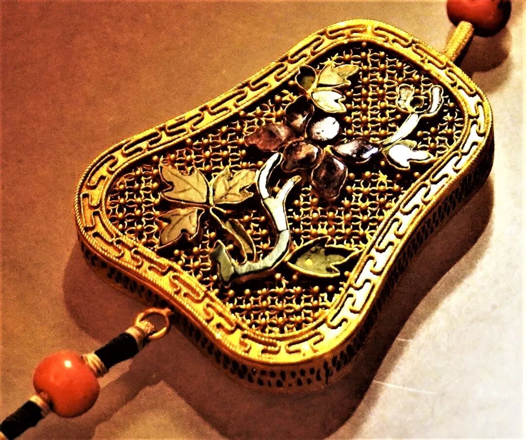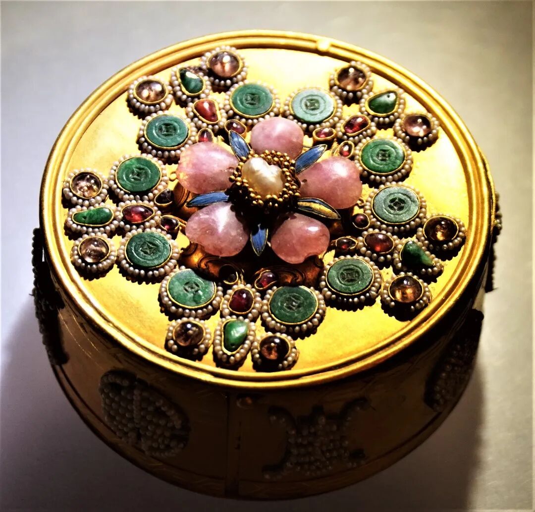 清代清代金银器中不可忽略的一类,是匣与盒。出自广州工匠的金镂花嵌宝八角盒为平面式盖,盒壁如同相连的八扇镂花窗。盒子通体镂雕、錾刻花卉纹,中心为碧玺雕牡丹花、翡翠叶、周边嵌红、蓝宝石、翡翠、碧玺,镶嵌各种宝石共计 318 块,金碧璀璨、十分夺目。