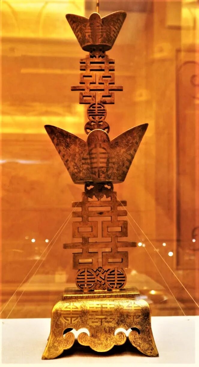 银镀金囍字蜡扦是清代宫廷大婚仪典中最具代表性的金银器之一,蜡扦的中轴擎杆由两个镂空“囍”字与元宝形蜡泪承盘组合而成,其上点缀蝙蝠、团寿等吉祥纹样。这对蜡扦是同治皇帝大婚时制备,设计精巧,寓意吉祥,与新婚红烛相映成景。