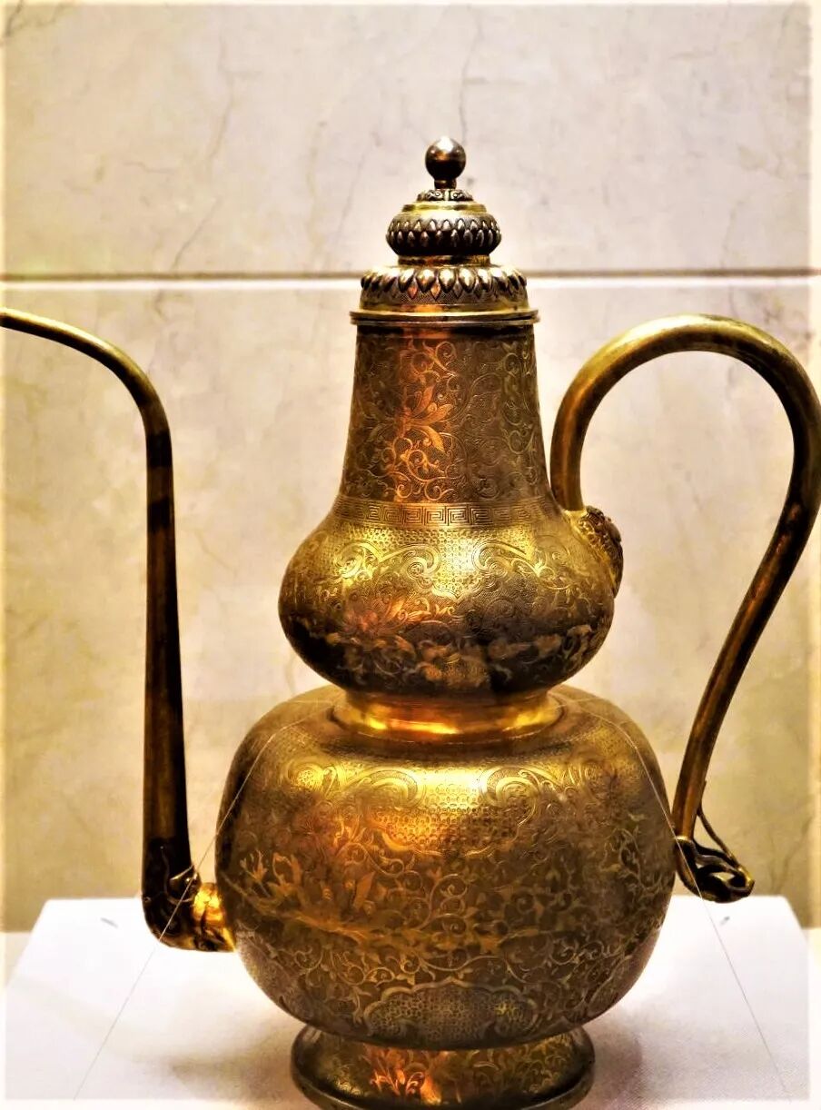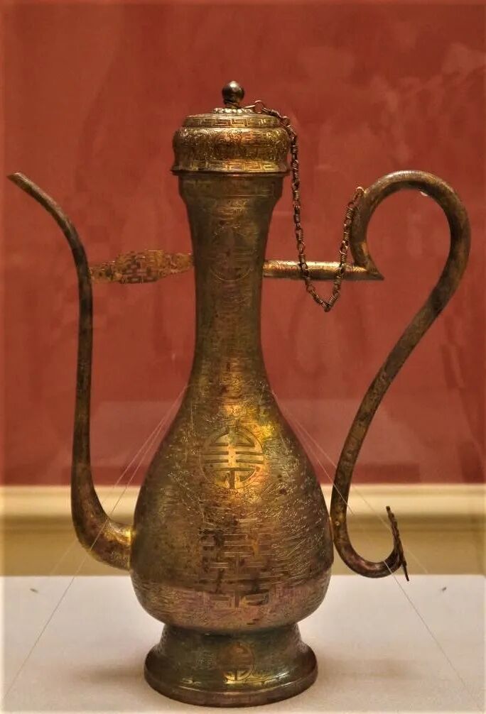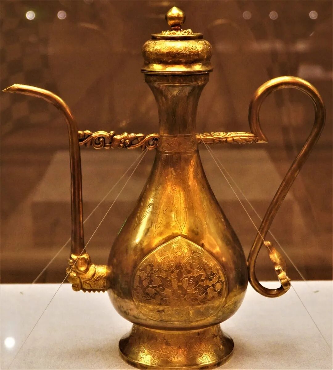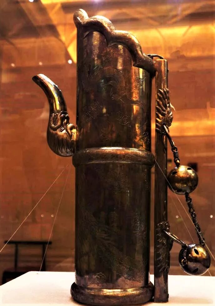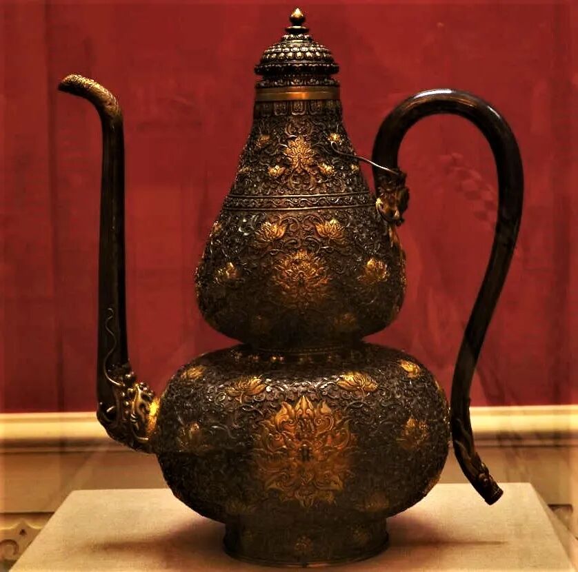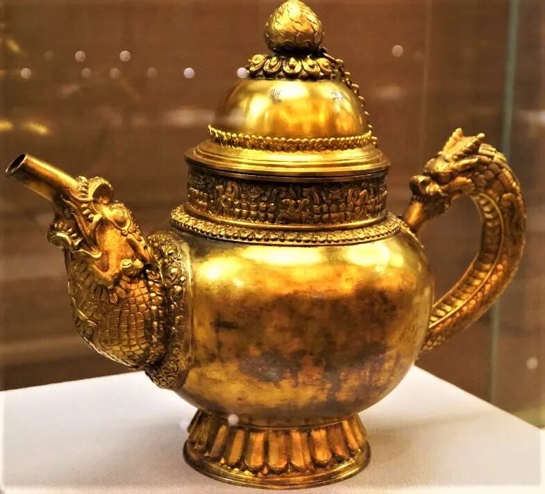 藏族盛装酥油茶的多穆壶,也为清宫使用。金银制作的多穆壶也是长筒式器身,器身打作凸起的两个“节”,便是仿木器的金属箍。