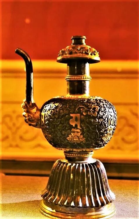 贲巴壶也称甘露瓶、藏草壶,是藏传佛教密宗修行仪式中的灌顶器皿,在清宫用作陈设器。制作于乾隆年间的银镀金贲巴壶,器腹垂蕤散舒,上有镀金西番莲托举的梵文,一侧兽口衔流,长颈中腰一道连珠纹,上方覆莲耸出小口,下方高座好似倒扣的一朵金菊。