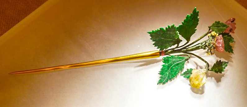 传统的耳挖簪,在清代成为金银簪钗中的一大类。较之于前朝,清代耳挖簪尺寸偏长,俗名一丈青。《红楼梦》第五十二回晴雯“向枕边取了一丈青”,正是指代此物。随着尺寸延长,簪头装饰得到更大空间,如金镶翡翠碧玺花叶簪、金镶宝蝶恋花耳挖簪。