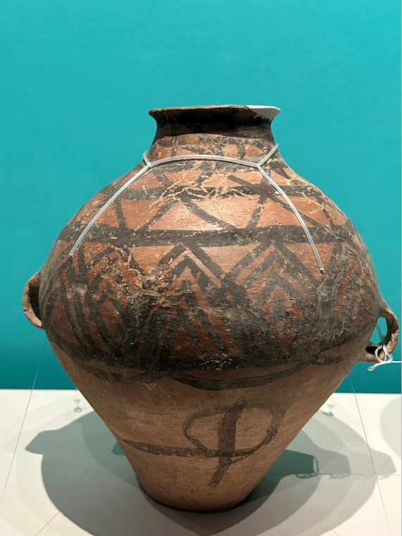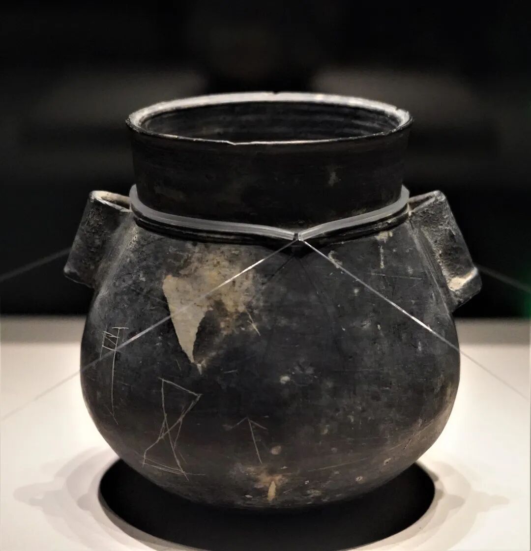 展厅展出一件来自良渚文化的刻符黑陶罐,外腹部有四个刻画符号,呈左高右低的形式横向排列,为陶器烧成后,用锋刃器刻出。工作人员称,这显示着文字的先行形态。关于这四个刻符符号的考释,目前学术界众说纷纭。