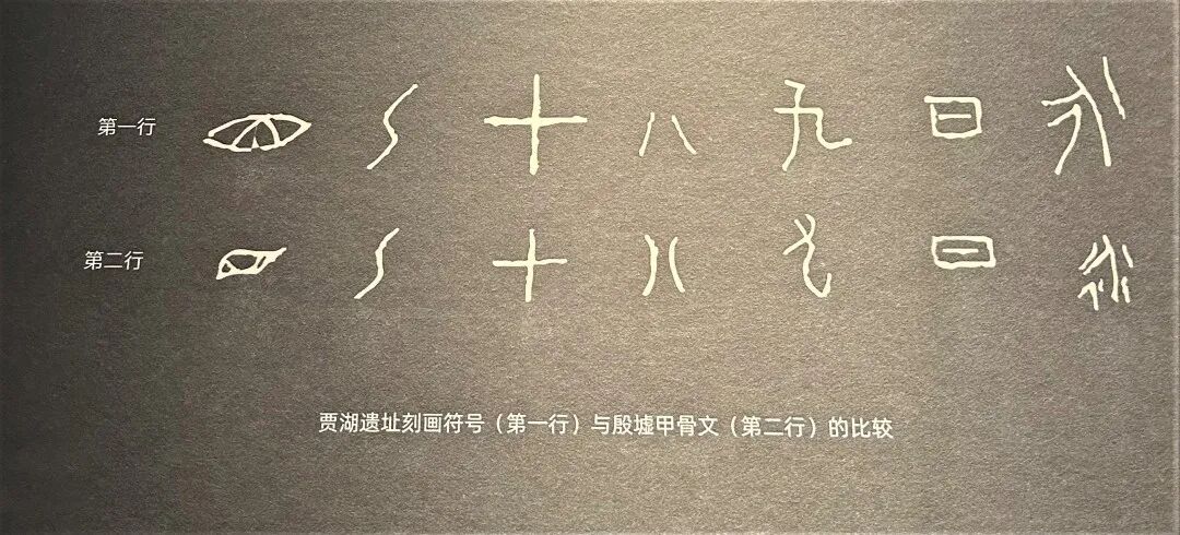 展馆展示了贾湖刻符(第一行)与殷墟甲骨文(第二行)的比较