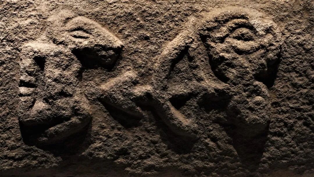 汉字从象形符号走来,在文字未成熟前,具象的图画性符号在各地出现。展厅展出的一块人射马石雕,出土于陕西榆林神木市的石峁遗址,原本镶嵌在墙体上,属于龙山文化(新石器时代晚期,主要分布在黄河中、下游的一种文化)。