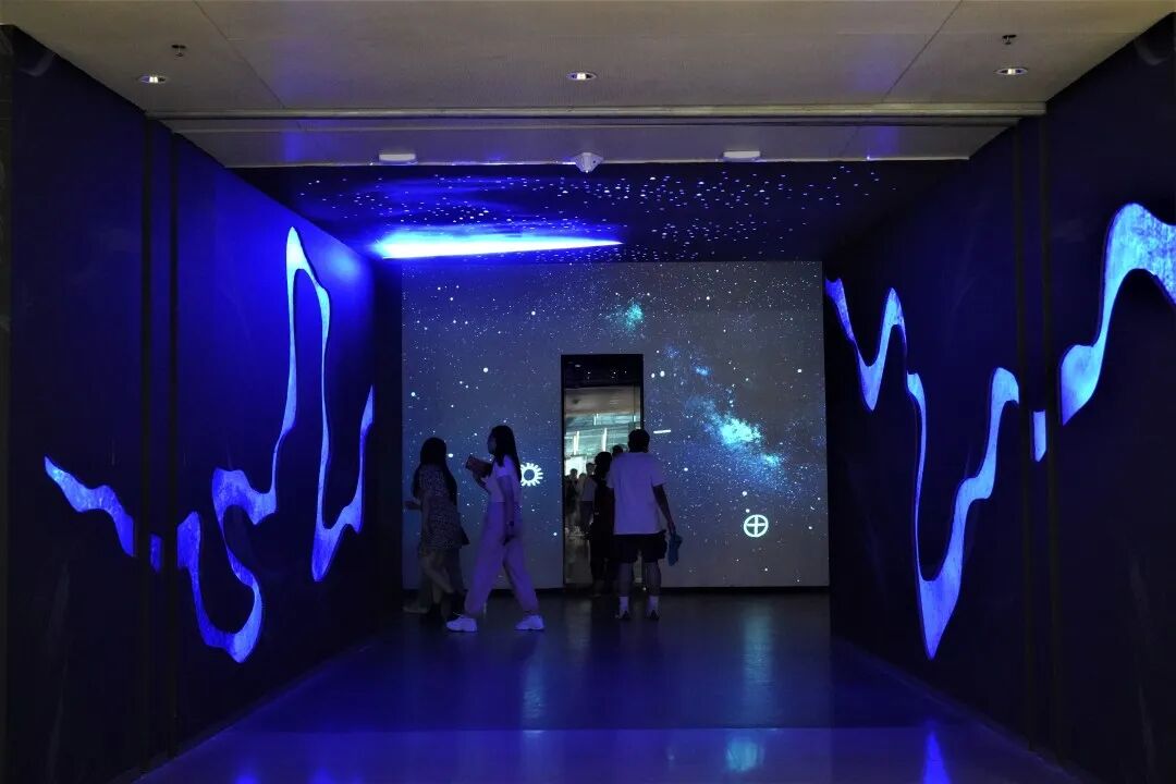走进特展区,一道画有长江、黄河幽暗的长廊,将观者拉入神秘氛围中。工作人员称,其策展寓意是走进漫漫历史长河,像人类在蒙昧、黑暗中探索,文字的出现,则像点点星光。长江、黄河则孕育了由文字带来的哲学思想,伦理道德和审美情趣。