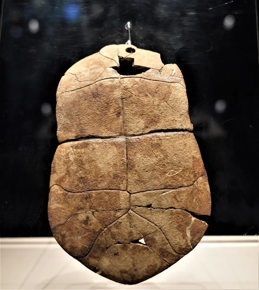 长廊的尽头,陈列着“文明的曙光”——一件来自距今 8000 余年的刻符龟甲,出土于河南省漯河市舞阳县贾湖遗址。龟甲下部刻有一个符号,像是一只正在向下看的眼睛。