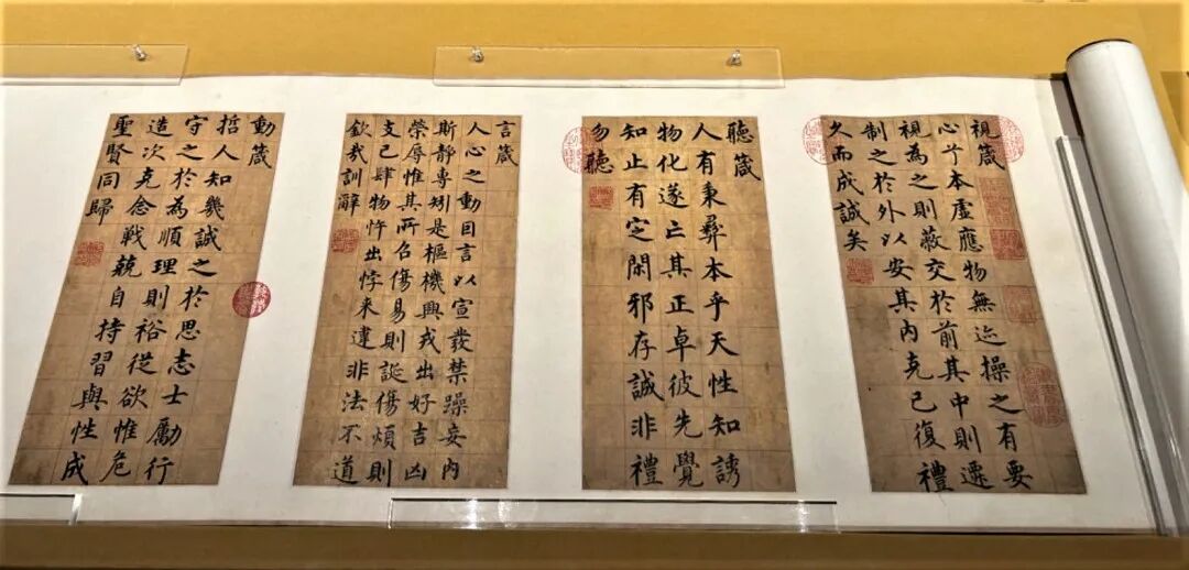 该馆策划研究部主任魏敏提出以“源远流长”四字来传达诠释展览四个板块的主题,颜色也分别从代表神秘和悠长的天青色、到代表着一统天下的大红,以橙黄过渡,再到意味着中华文化百花齐放、光芒照耀的明黄来映衬。