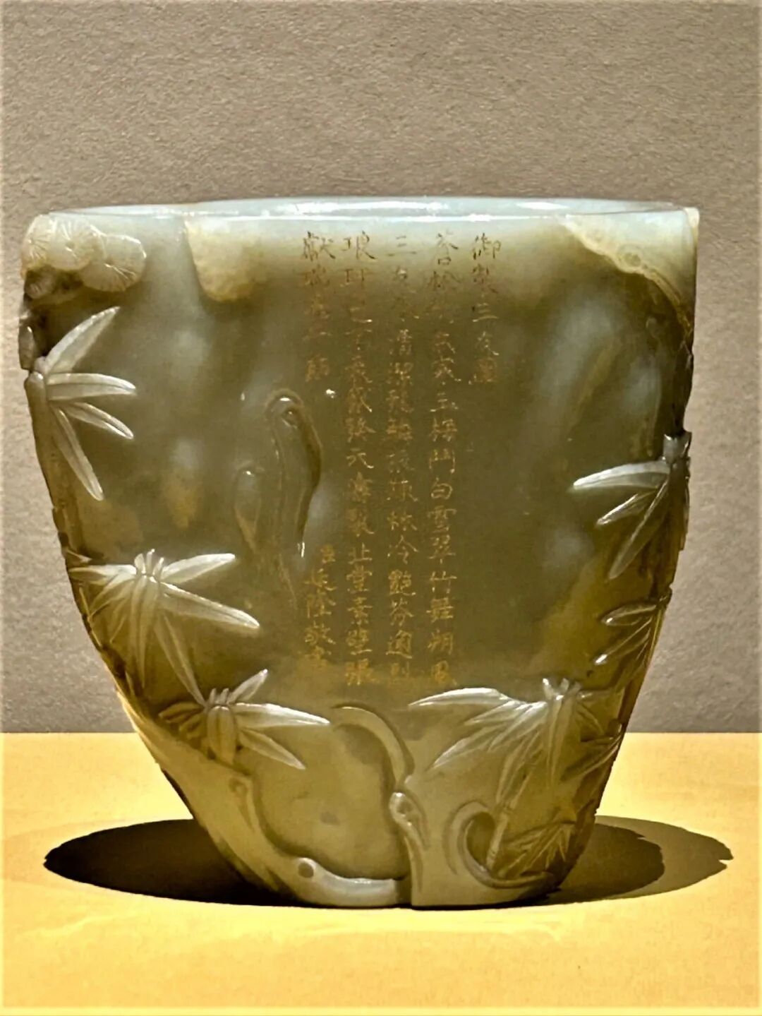带皮青玉刻诗三友图笔筒