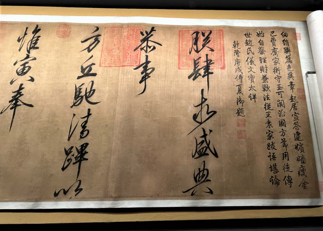工作人员称,此件展出的《赵佶行书方丘敕卷》为国家一级文物,作于政和四年五月,现藏辽宁省博物馆。全贴字贴凌厉风行,与他著名的瘦金体相比,这卷行书器宇更加轩昂,风骨更加潇洒。他的行书、草书极为罕见,不可多得的艺术佳作,此帖质地为五幅不同颜色描有金花凤的罗绢,长两米多,内容提到他在方丘举行祭地礼仪,六宫妃嫔依照惯例,问候他的起居,礼成之后表示要赏赐大家。