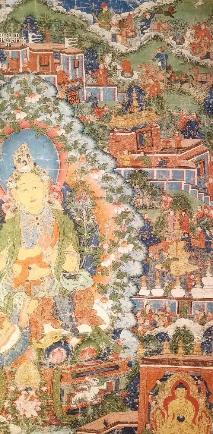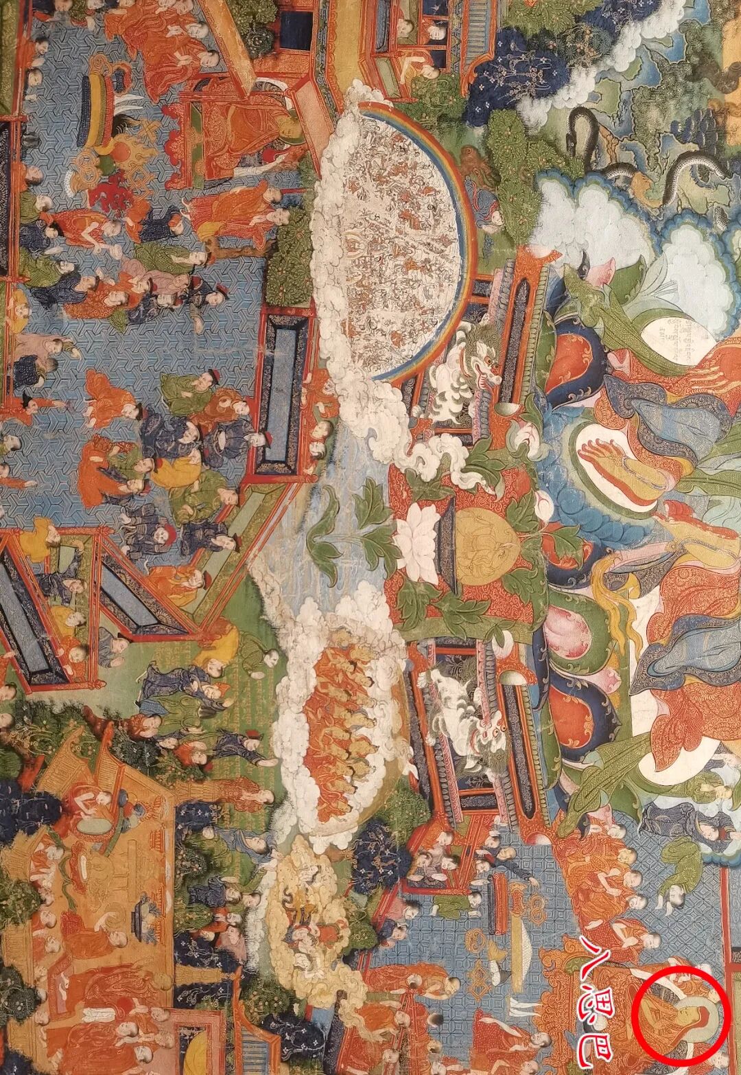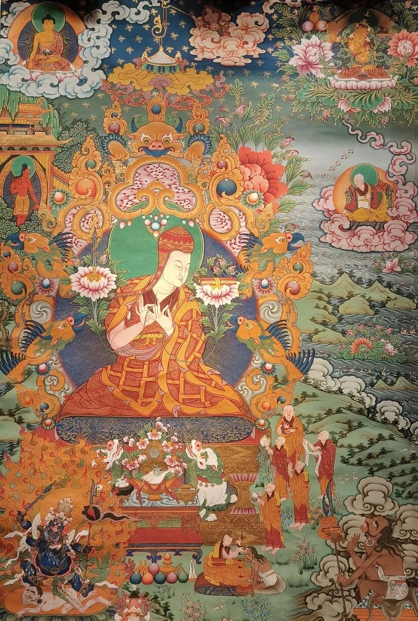 3、唐卡将画面关系平面化,将所有事件从三维的立体整理到了近似二维的画面,在构图上带有创作者浓烈的主观意识,因此对观众的鉴赏理解能力提出较高要求。想要弄懂一幅唐卡全部历史信息,需要一定的西藏史学、萨迦派系等方面的史识积累。