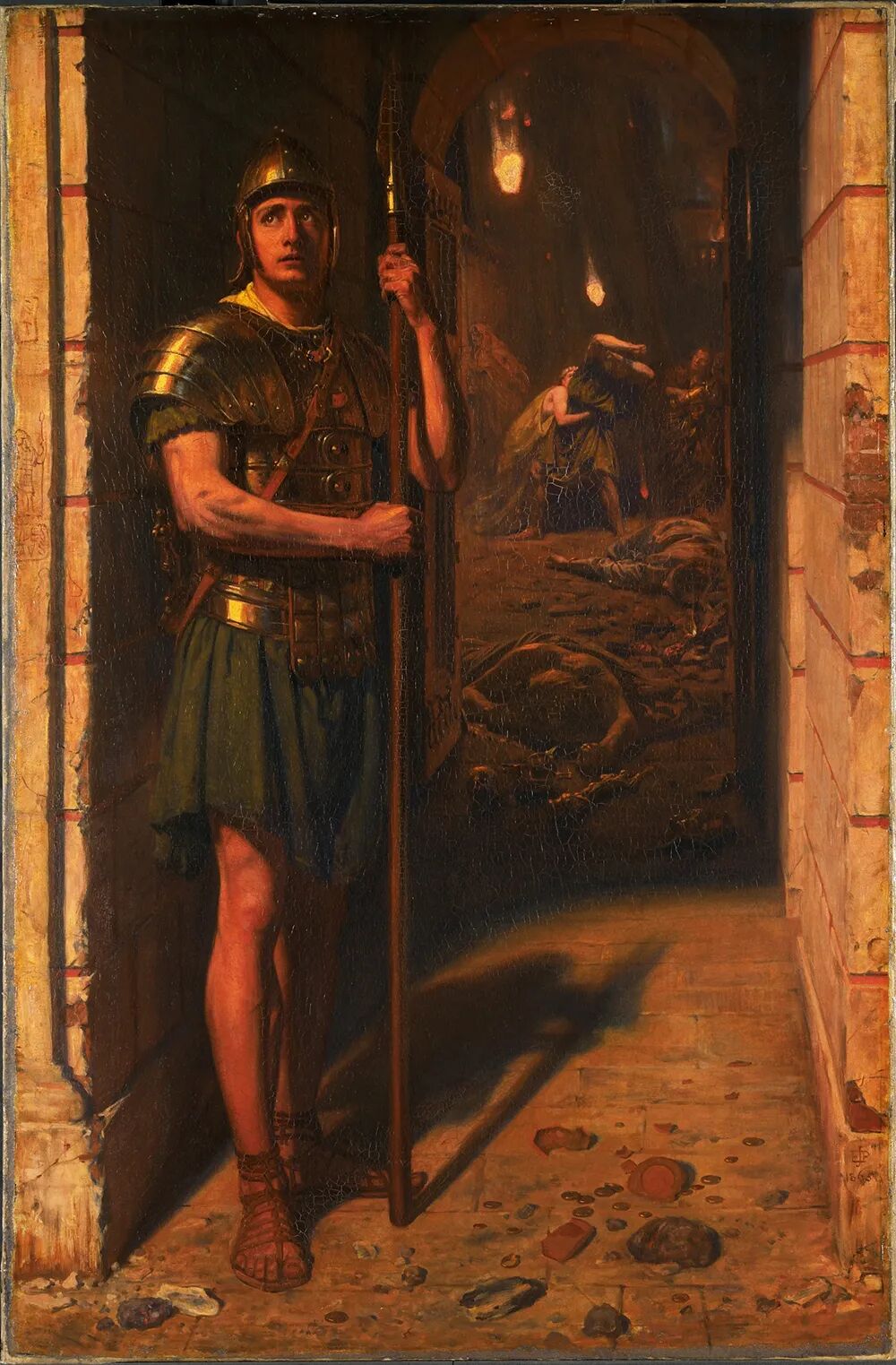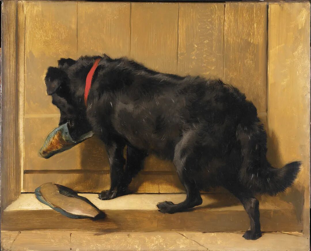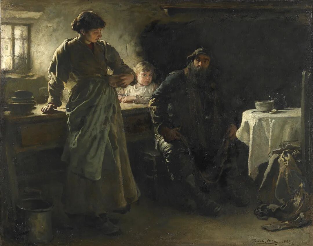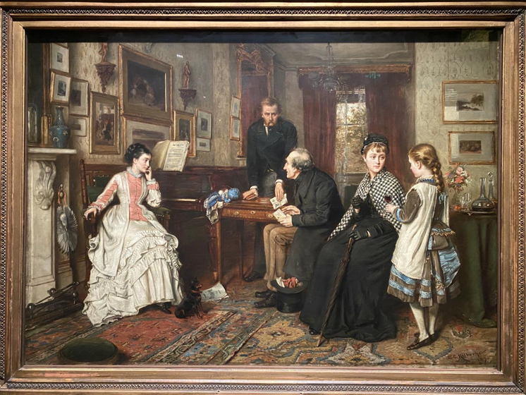 虽然乔治并不属于拉斐尔前派,但这幅画的细节满载折射出了拉斐尔前派对其的影响。作品描绘的是一个富裕的中产阶级客厅。一位身穿丧服的年轻寡妇和她衣衫褴褛的父亲突然出现在他们富有的亲戚家里要钱。富有的姐夫手里拿着钱包,不情愿地递了几张钞票给岳父,同时斜睨着女儿,好像在不满意女儿给小姨倒酒。画面左下角小狗的防御姿态,也从另一个角度表明了主人的态度。同时,从墙上挂着的不同时代的画作和家具细节,也显示出姐夫的财产并不是自己奋斗得来的,而是继承得来的。
