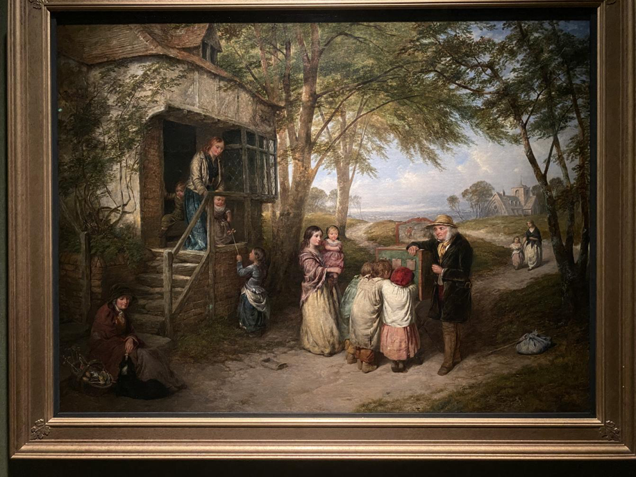 云淡风轻的乡间小路上,一个表演者在展示西洋镜,但是这并不是当时乡村的真实写照,只是画家对于理想乡村生活的描摹。当时的工业革命带来的都市喧闹,让画家们回归自然和乡村来寻求内心的平静。