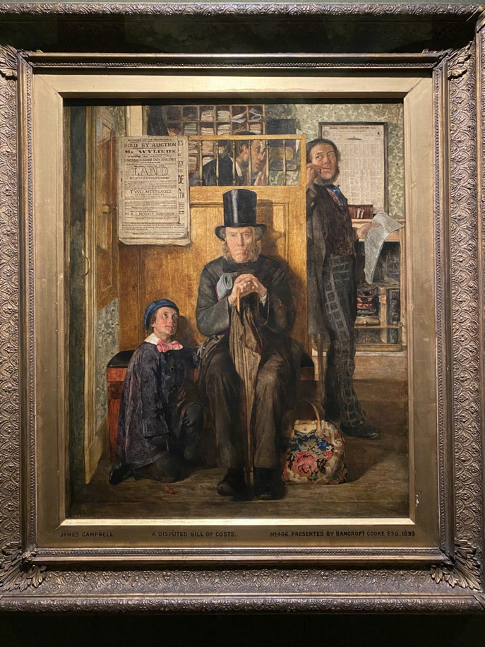 利物浦一间律师办公室里,一位表情倔强的老人在等待见他的律师来处理账单问题,这点可以从作品的原名《有争议的账单》(a disputed bill of costs)看出;老人从帽子到雨伞位于一条垂直线,显示出他十分紧张和不悦;旁边的小男孩可能是他的孙子,正徒劳地指着旋转的陀螺想吸引老人的注意;后面有两个文员在聊着八卦。画作中每一个细节都描述得非常精准,甚至包括贴在墙上的利物浦年鉴与表格、地上编织包的花纹、左边墙上的报纸等。