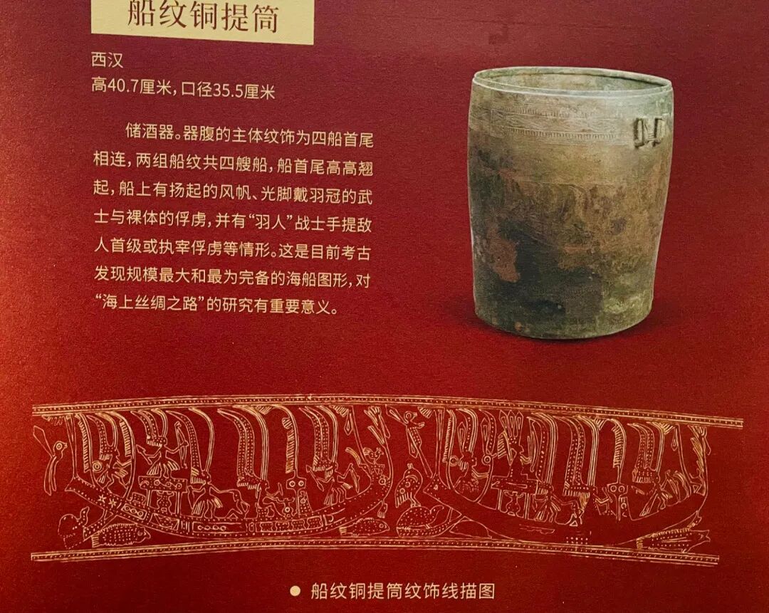 南越人熟习水性,善于用舟。南越王墓出土的船纹铜提筒上发现了目前规模最大和最为完备的海船图形。有学者认为,图案中类似水密舱的结构和扬起的船帆,表明当时的南越人已经掌握了水密舱和风帆航运技术,使远洋航行成为可能。船上的“羽人”战士则与古代百越民族的信仰习俗有关。西汉刘安《淮南子·地形训》记载:“泽水出其西北陬,入于南海羽民之南。”