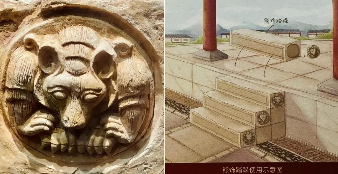 宫门匾额上大书长乐宫、未央宫,主殿屋檐上一排整齐的“万岁”瓦当,与汉宫中的同款相比几可乱真。踏上殿前台阶,浮雕的巨熊恭顺地伏卧于踏跺两端,如同被勇猛的武士踩踏在脚下,这便是南越霸主的威严。